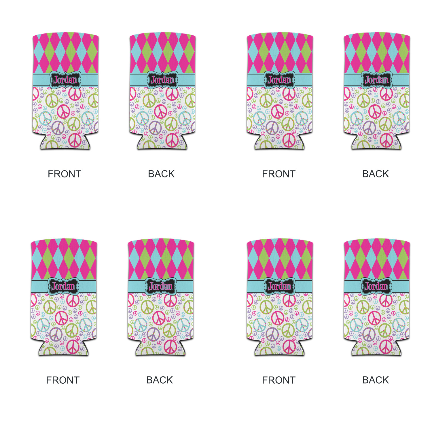 The Harlequin and Peace Signs Design is sure a nice throw back to the 70s. The retro design features harlequin print on the top half in hot pink, lime and light teal. The bottom half is colorful peace signs in the same color scheme on a black background. The larger peace signs have fun polka dots and are surrounded by smaller solid colored peace signs.