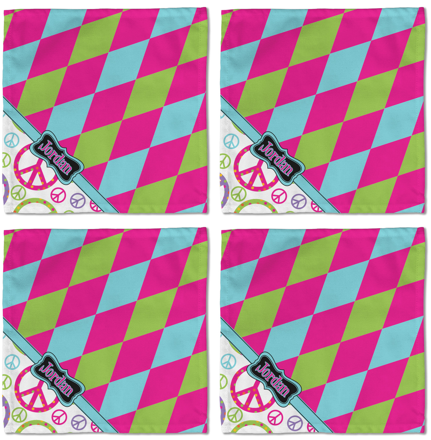 The Harlequin and Peace Signs Design is sure a nice throw back to the 70s. The retro design features harlequin print on the top half in hot pink, lime and light teal. The bottom half is colorful peace signs in the same color scheme on a black background. The larger peace signs have fun polka dots and are surrounded by smaller solid colored peace signs.