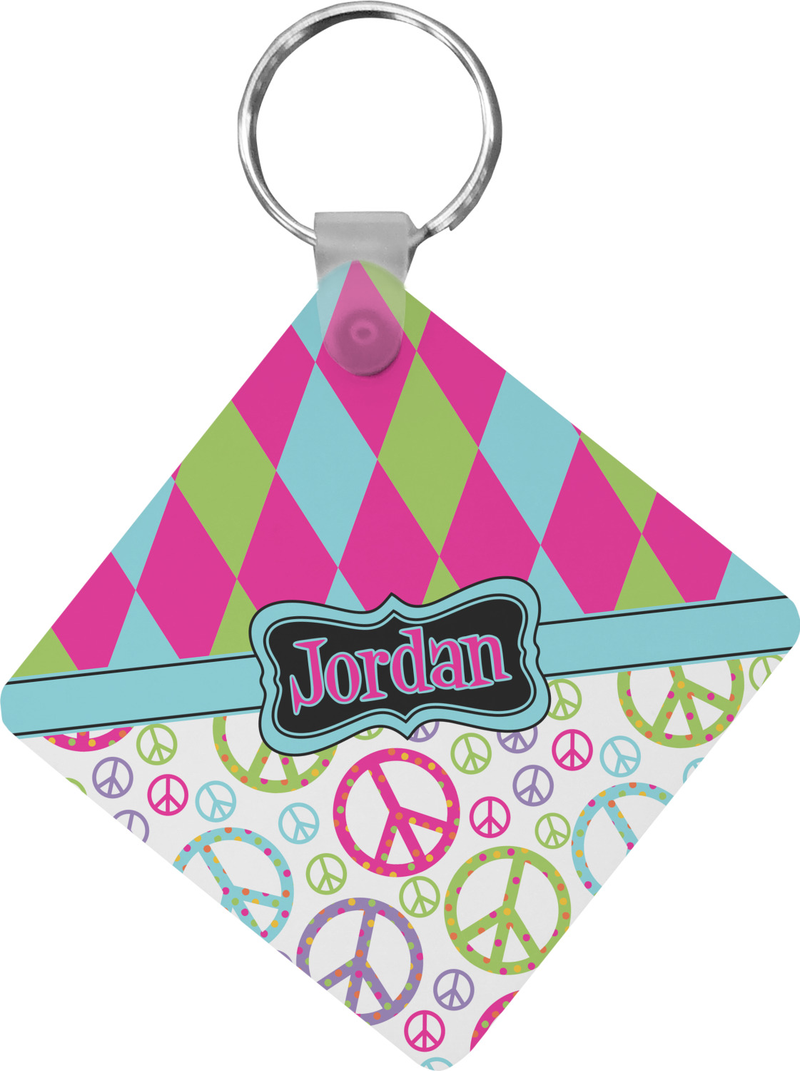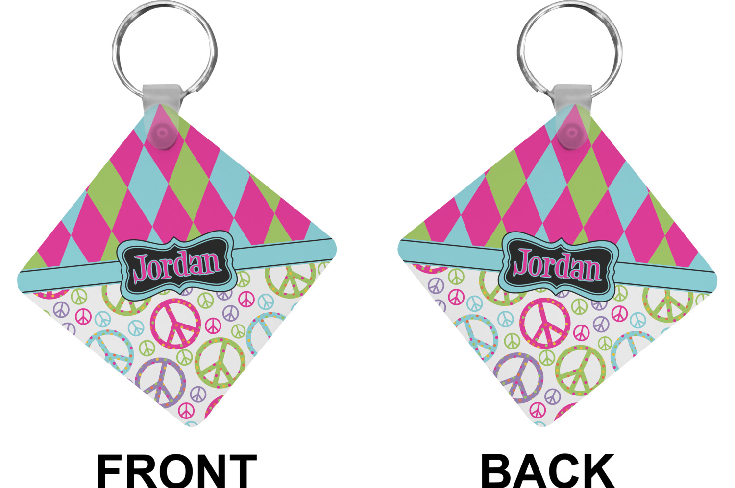 Our personalized keychains attach to the included metal, split key ring with a plastic, removable snap. Since a metal ring is included with your purchase, you have the liberty to keep your keys together on the ring, with or without your unique keychain. We offer this keychain in three different shapes: circle, heart, or diamond. We print your personalized design(s) on both sides of the key chain, and the surface has a glossy, reflective finish that only emphasizes your design. Each keychain is approximately 2.25 by 2.25 inches.