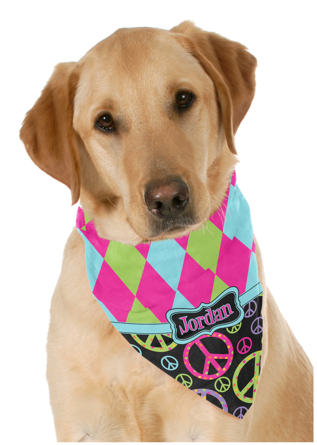 This beautiful pet bandana really is the perfect accessory. It is made from a silky feeling polyester and measures at approximately 23" x 23". Your personalization will be printed on a diagonal, so that you are able to read the personalization when folded into a triangle. This bandana fits best on large dogs, but can be folded smaller if there is no personalized text to fit smaller pets.