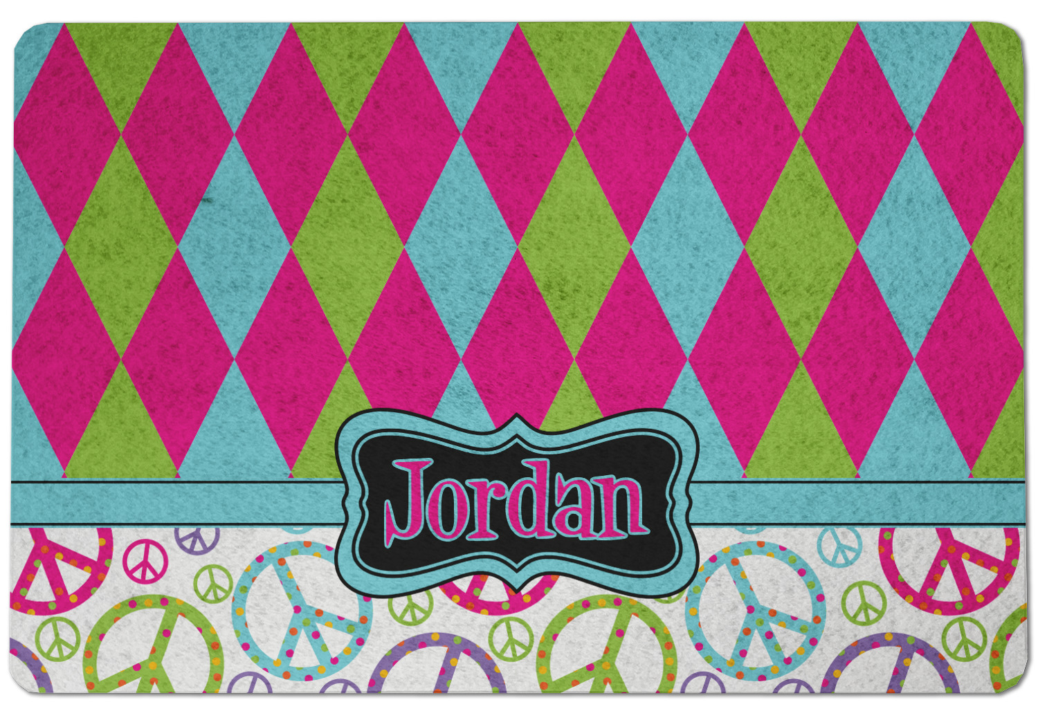The Harlequin and Peace Signs Design is sure a nice throw back to the 70s. The retro design features harlequin print on the top half in hot pink, lime and light teal. The bottom half is colorful peace signs in the same color scheme on a black background. The larger peace signs have fun polka dots and are surrounded by smaller solid colored peace signs.