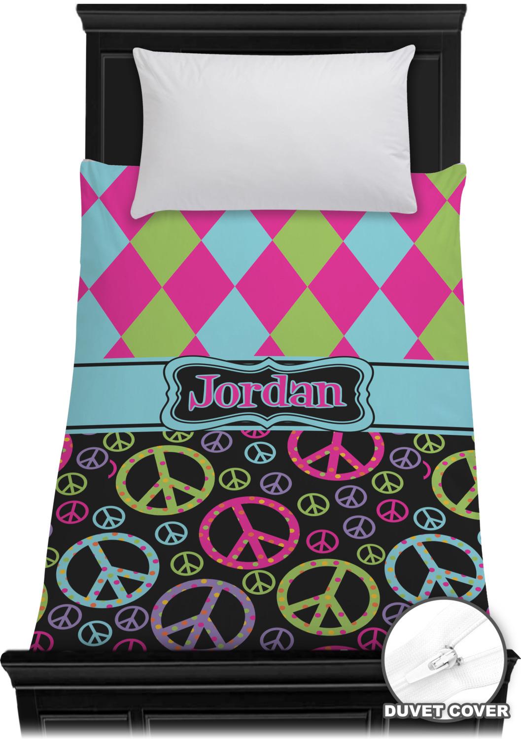 The Harlequin and Peace Signs Design is sure a nice throw back to the 70s. The retro design features harlequin print on the top half in hot pink, lime and light teal. The bottom half is colorful peace signs in the same color scheme on a black background. The larger peace signs have fun polka dots and are surrounded by smaller solid colored peace signs.