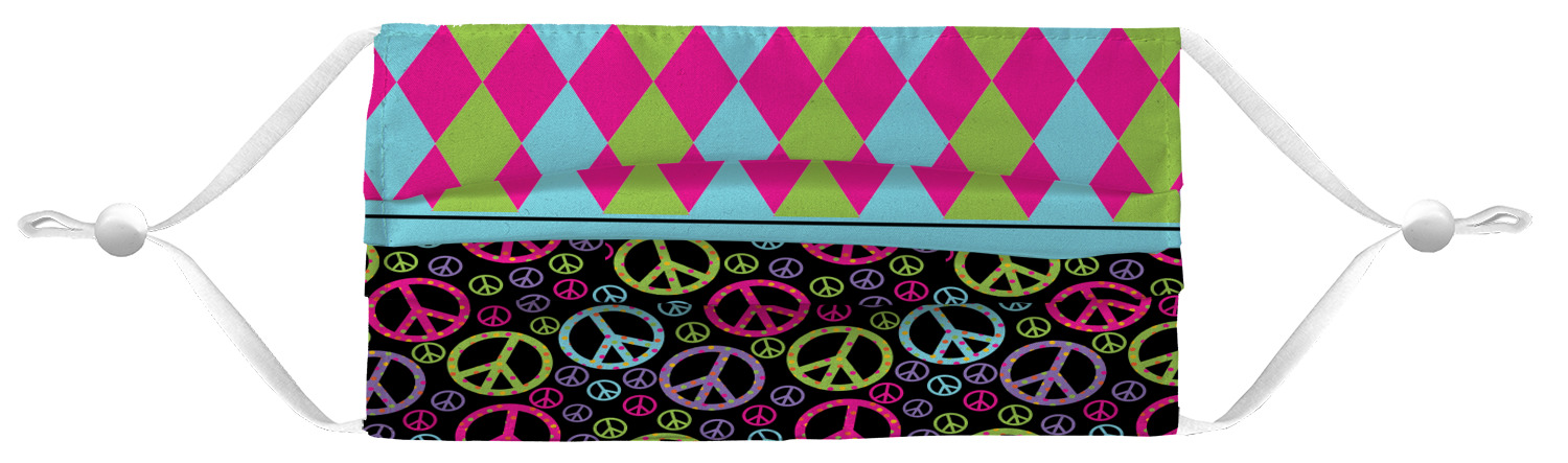 The Harlequin and Peace Signs Design is sure a nice throw back to the 70s. The retro design features harlequin print on the top half in hot pink, lime and light teal. The bottom half is colorful peace signs in the same color scheme on a black background. The larger peace signs have fun polka dots and are surrounded by smaller solid colored peace signs.
