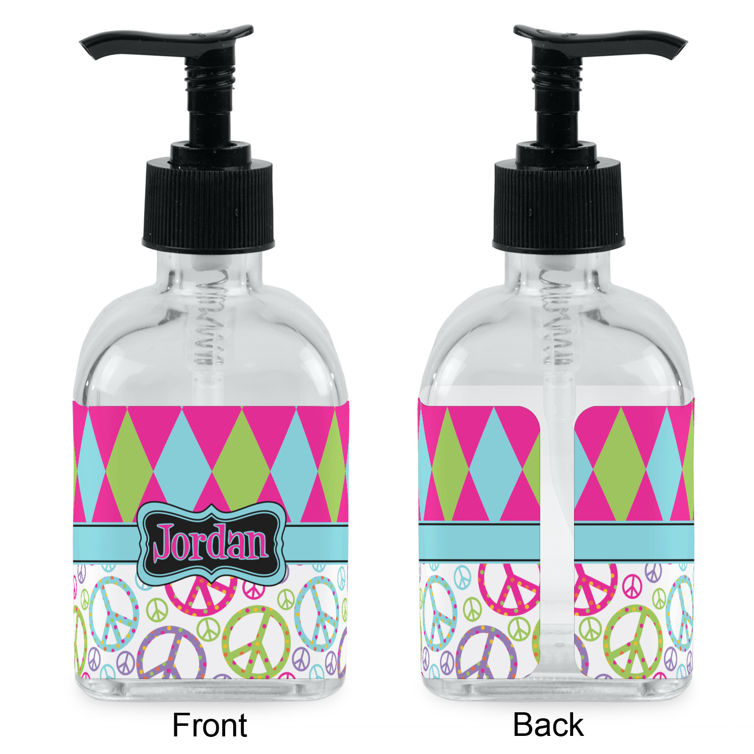 Crafted from a high-quality glass, these soap dispensers and lotion dispensers are durable and robust, while still looking elegant. They are sold with black pumps. Each soap dispenser pump measures at 6.5 by 2.25 inches. On these soap pumps, we display your customized design on a personalized vinyl adhesive on three sides. That way, you can judge how much liquid is in the bottles from the back.