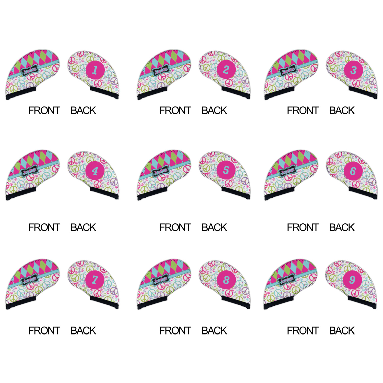 The Harlequin and Peace Signs Design is sure a nice throw back to the 70s. The retro design features harlequin print on the top half in hot pink, lime and light teal. The bottom half is colorful peace signs in the same color scheme on a black background. The larger peace signs have fun polka dots and are surrounded by smaller solid colored peace signs.