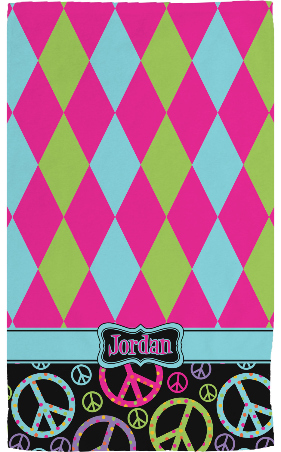 The Harlequin and Peace Signs Design is sure a nice throw back to the 70s. The retro design features harlequin print on the top half in hot pink, lime and light teal. The bottom half is colorful peace signs in the same color scheme on a black background. The larger peace signs have fun polka dots and are surrounded by smaller solid colored peace signs.