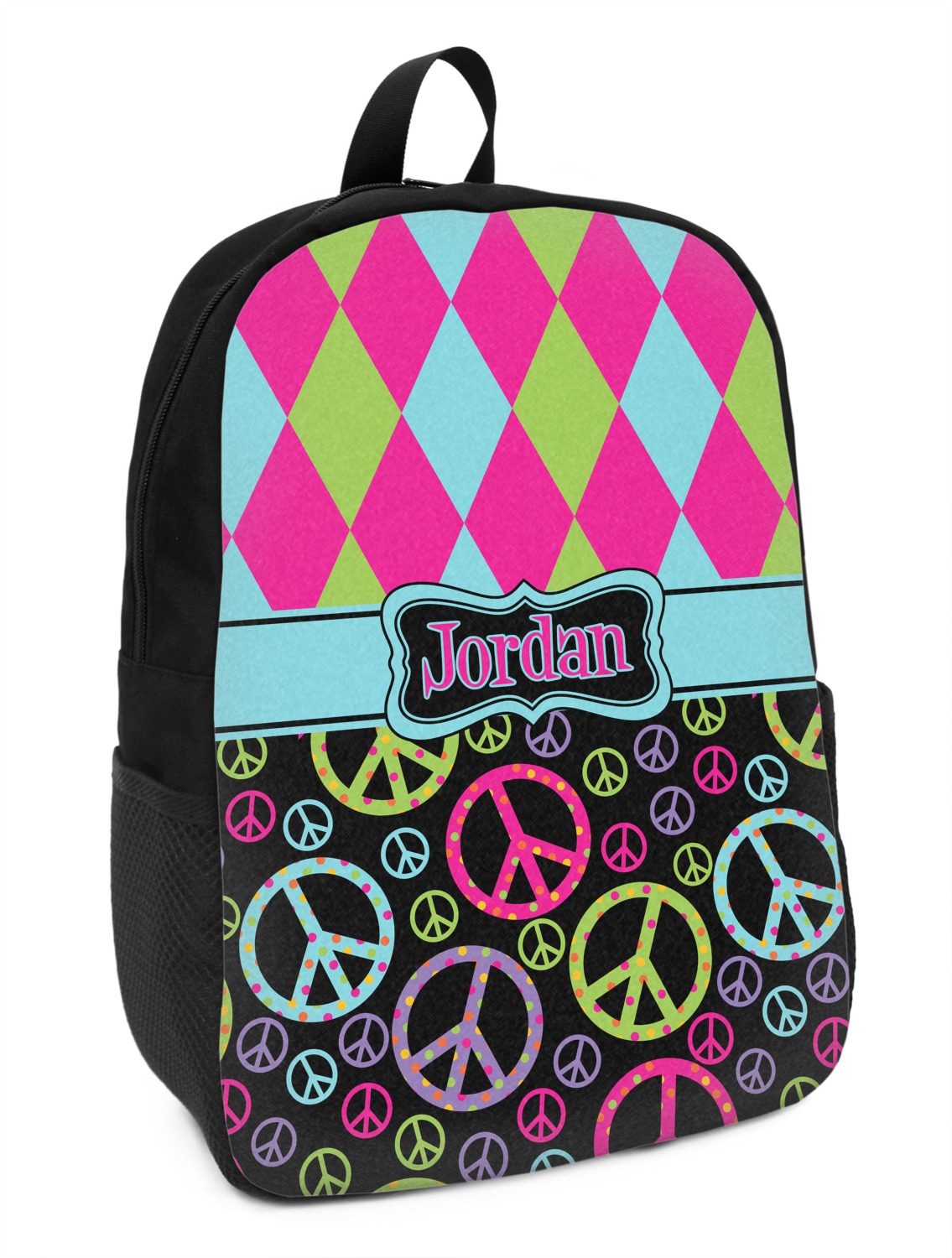 The Harlequin and Peace Signs Design is sure a nice throw back to the 70s. The retro design features harlequin print on the top half in hot pink, lime and light teal. The bottom half is colorful peace signs in the same color scheme on a black background. The larger peace signs have fun polka dots and are surrounded by smaller solid colored peace signs.