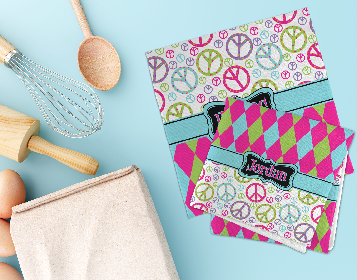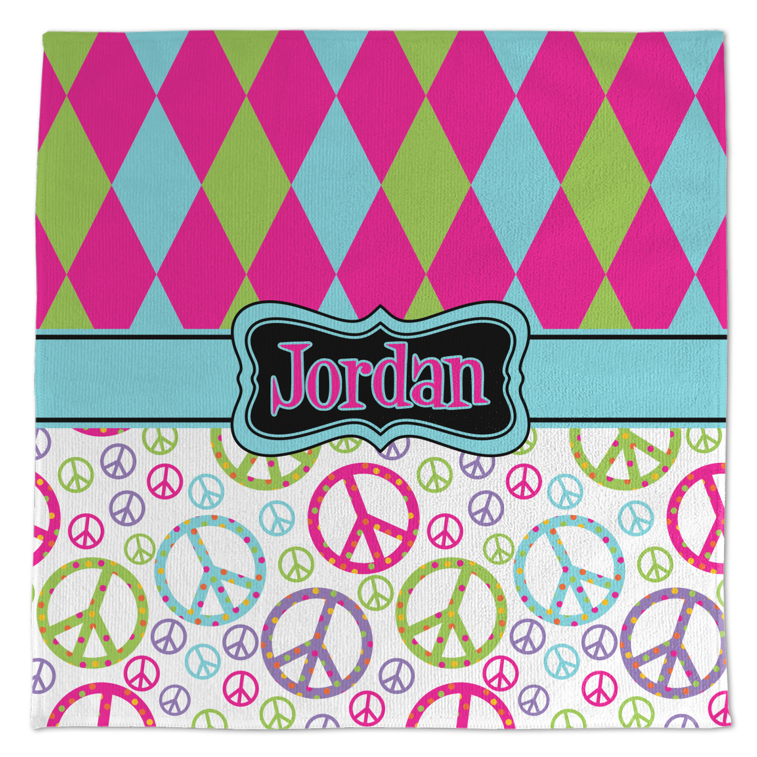 The Harlequin and Peace Signs Design is sure a nice throw back to the 70s. The retro design features harlequin print on the top half in hot pink, lime and light teal. The bottom half is colorful peace signs in the same color scheme on a black background. The larger peace signs have fun polka dots and are surrounded by smaller solid colored peace signs.
