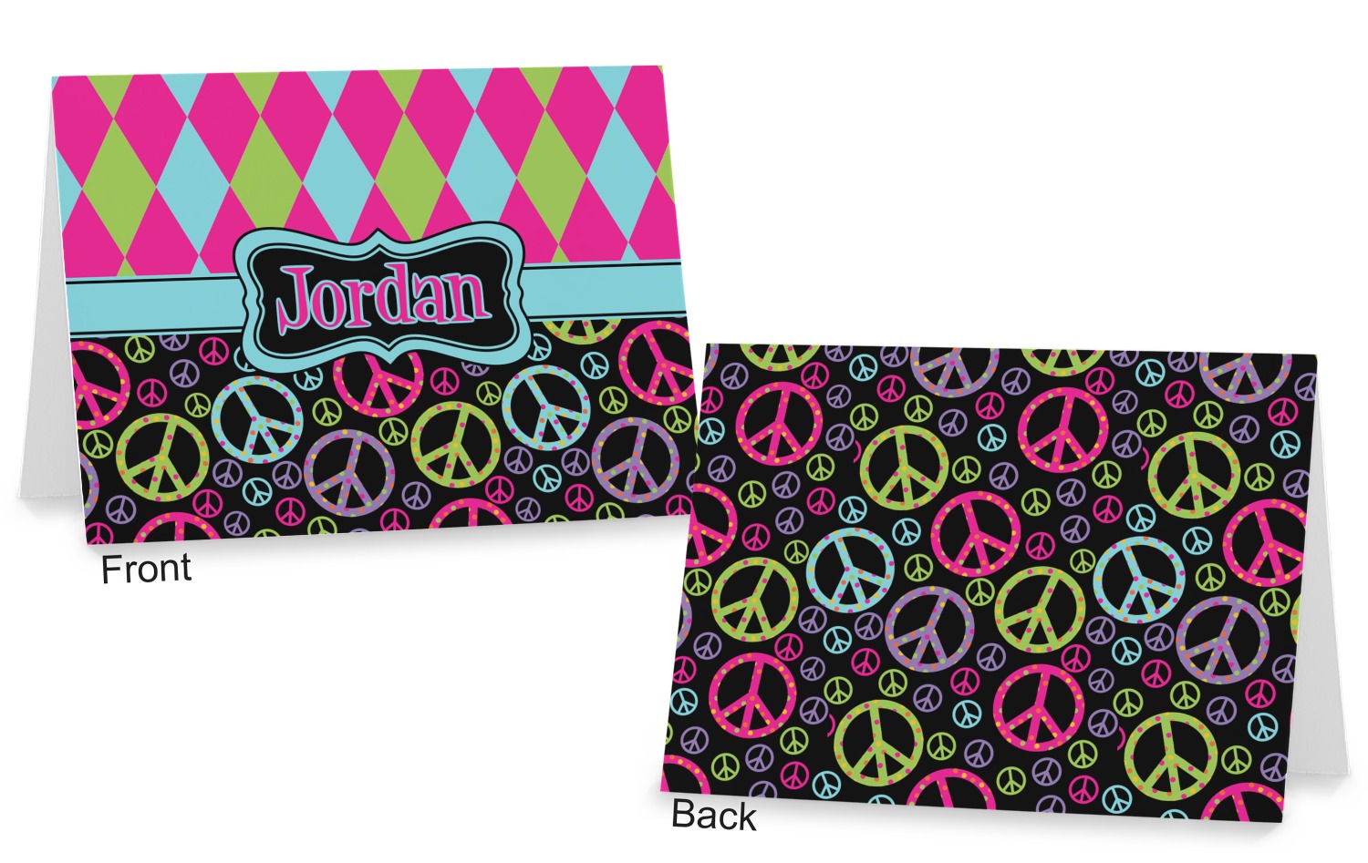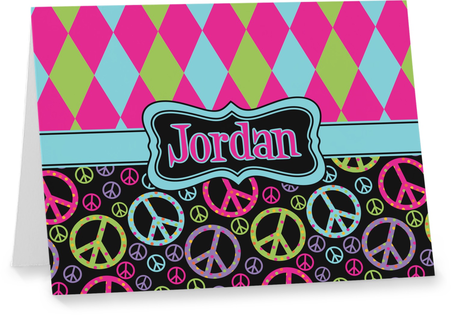 The Harlequin and Peace Signs Design is sure a nice throw back to the 70s. The retro design features harlequin print on the top half in hot pink, lime and light teal. The bottom half is colorful peace signs in the same color scheme on a black background. The larger peace signs have fun polka dots and are surrounded by smaller solid colored peace signs.