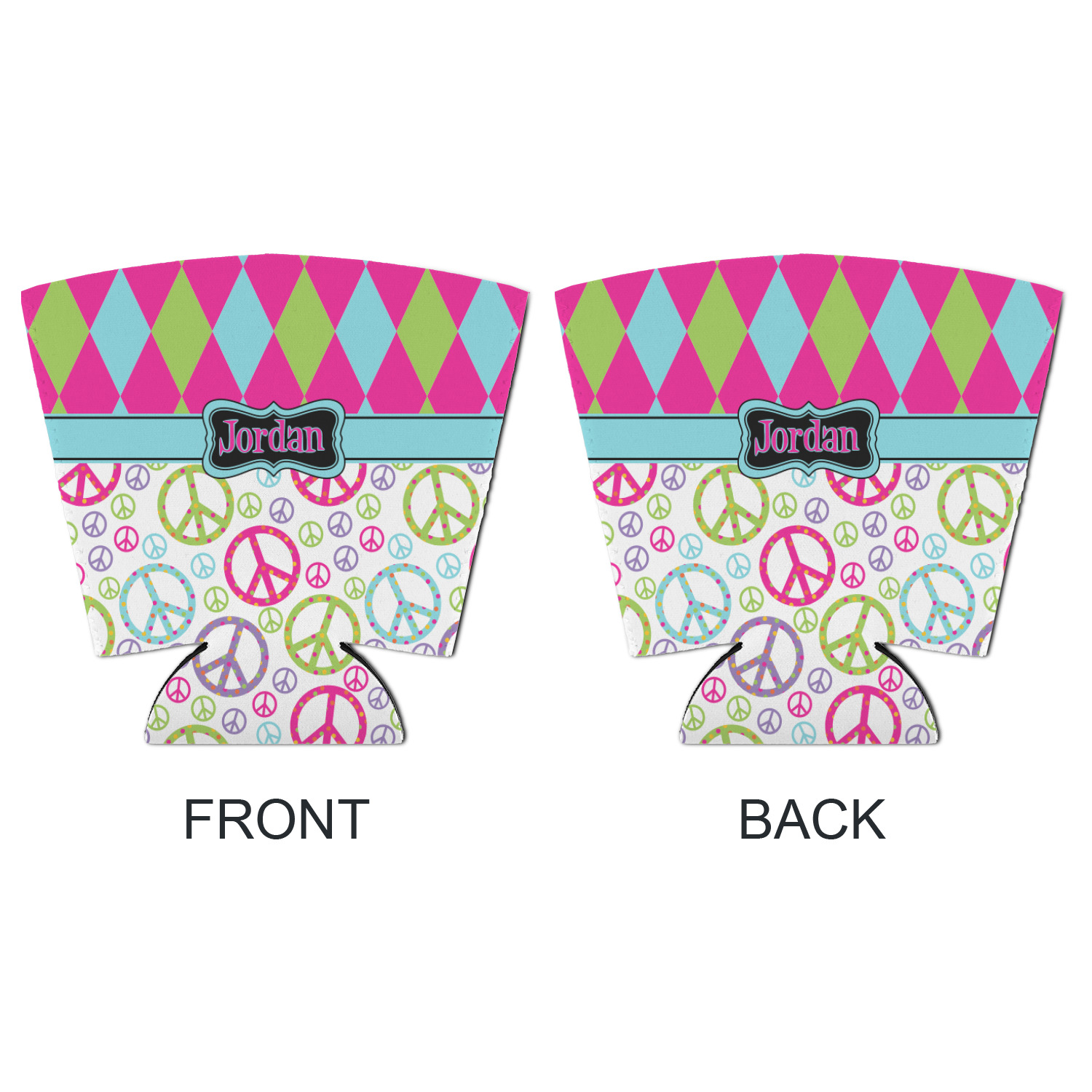 The Harlequin and Peace Signs Design is sure a nice throw back to the 70s. The retro design features harlequin print on the top half in hot pink, lime and light teal. The bottom half is colorful peace signs in the same color scheme on a black background. The larger peace signs have fun polka dots and are surrounded by smaller solid colored peace signs.