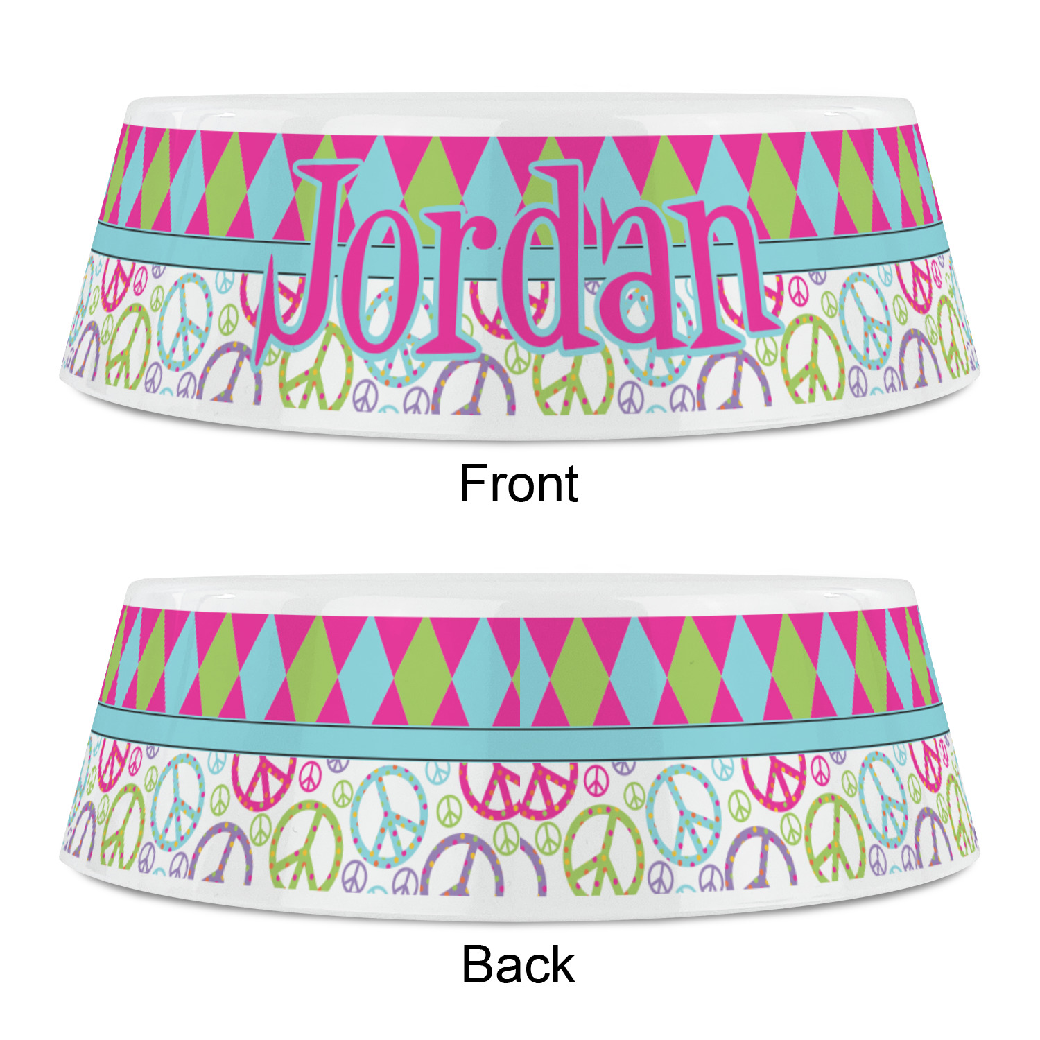The Harlequin and Peace Signs Design is sure a nice throw back to the 70s. The retro design features harlequin print on the top half in hot pink, lime and light teal. The bottom half is colorful peace signs in the same color scheme on a black background. The larger peace signs have fun polka dots and are surrounded by smaller solid colored peace signs.