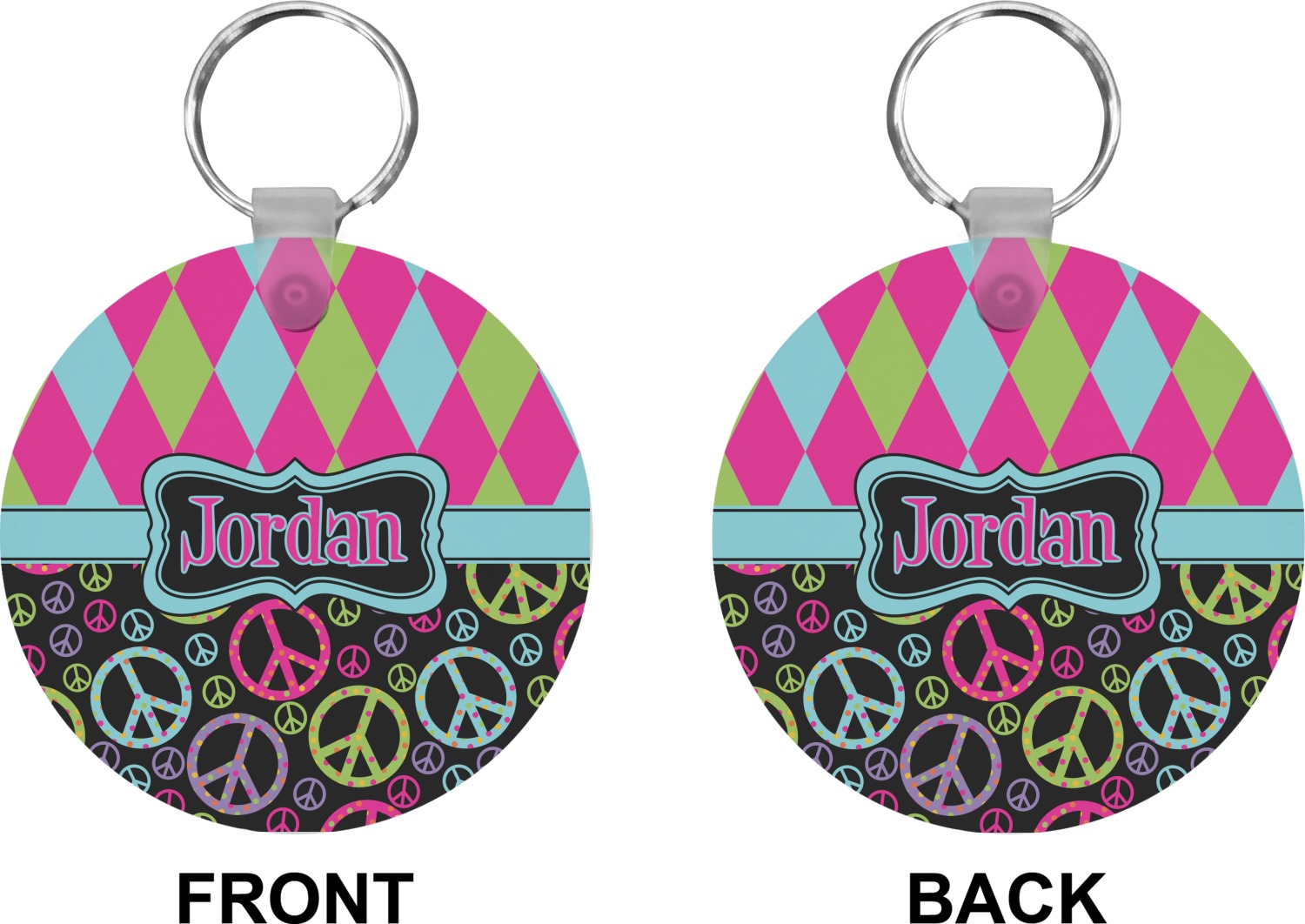 Our personalized keychains attach to the included metal, split key ring with a plastic, removable snap. Since a metal ring is included with your purchase, you have the liberty to keep your keys together on the ring, with or without your unique keychain. We offer this keychain in three different shapes: circle, heart, or diamond. We print your personalized design(s) on both sides of the key chain, and the surface has a glossy, reflective finish that only emphasizes your design. Each keychain is approximately 2.25 by 2.25 inches.