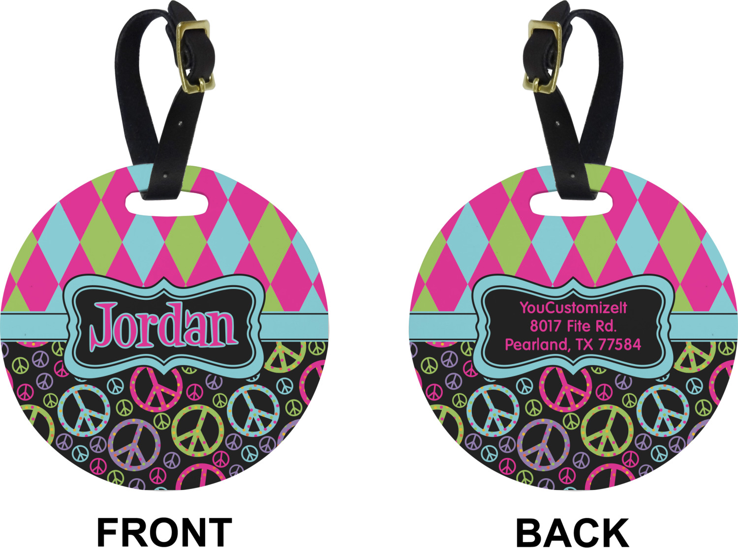 These personalized bag tags are sold in a variety of shapes, so that you may find the product that meets your vision exactly. We sell a round luggage tag, which measures at approximately 4" x 4". Our square luggage tag is about 3.5" x 3.5", while our rectangular version is 2.75" x 4 ".