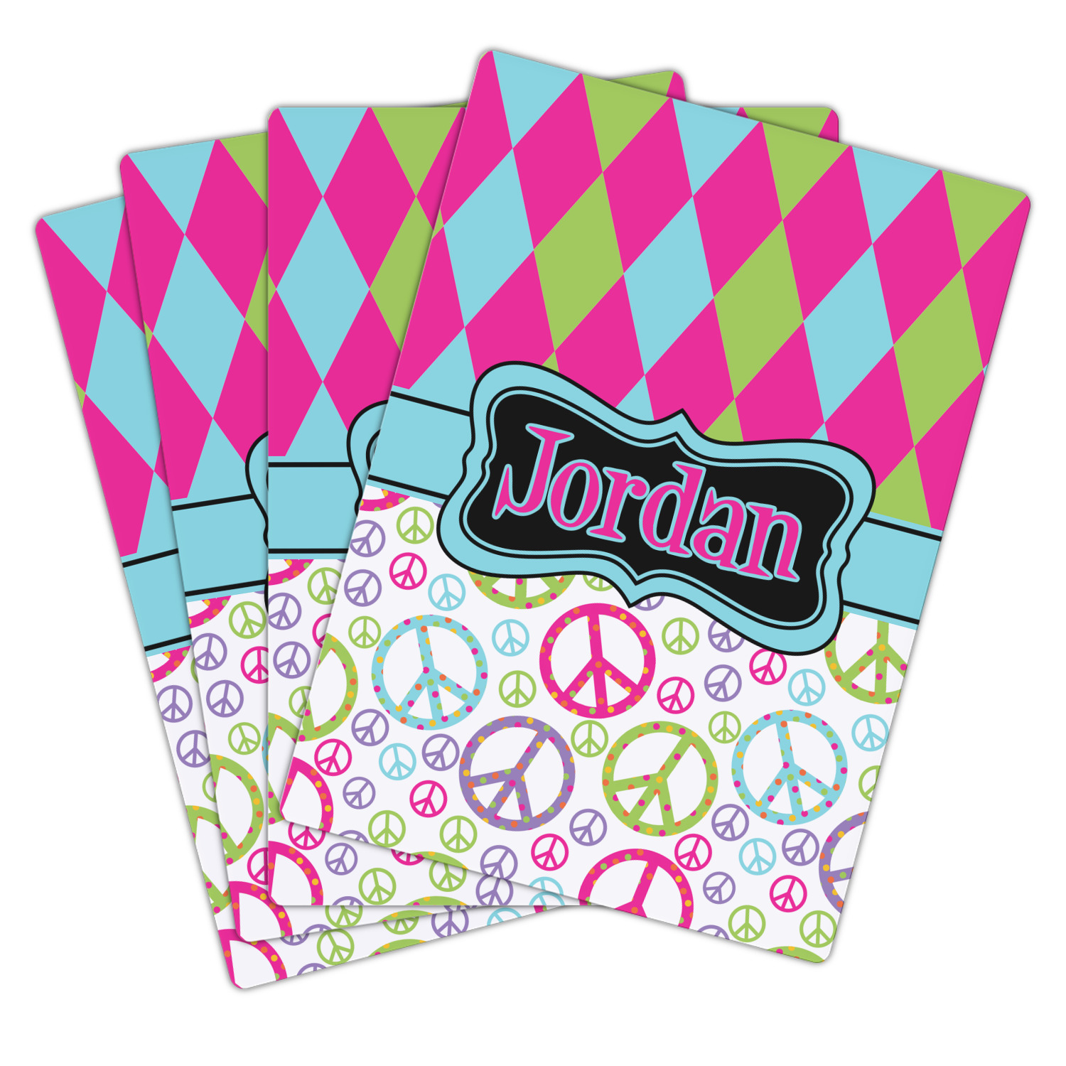 The Harlequin and Peace Signs Design is sure a nice throw back to the 70s. The retro design features harlequin print on the top half in hot pink, lime and light teal. The bottom half is colorful peace signs in the same color scheme on a black background. The larger peace signs have fun polka dots and are surrounded by smaller solid colored peace signs.