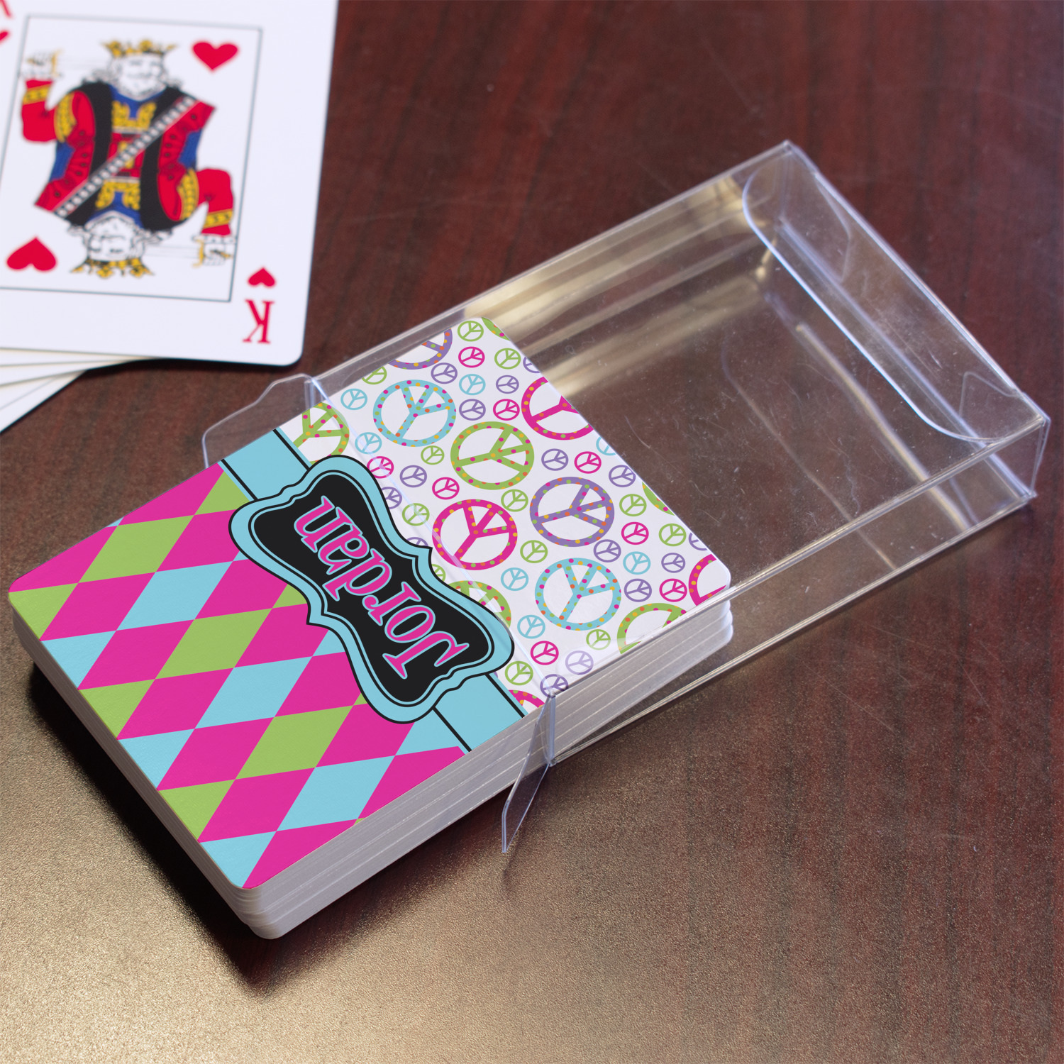 The customization / personalization is printed on the back side. The playing cards have a low gloss coating on both sides. The cards are packaged in a clear plastic box.