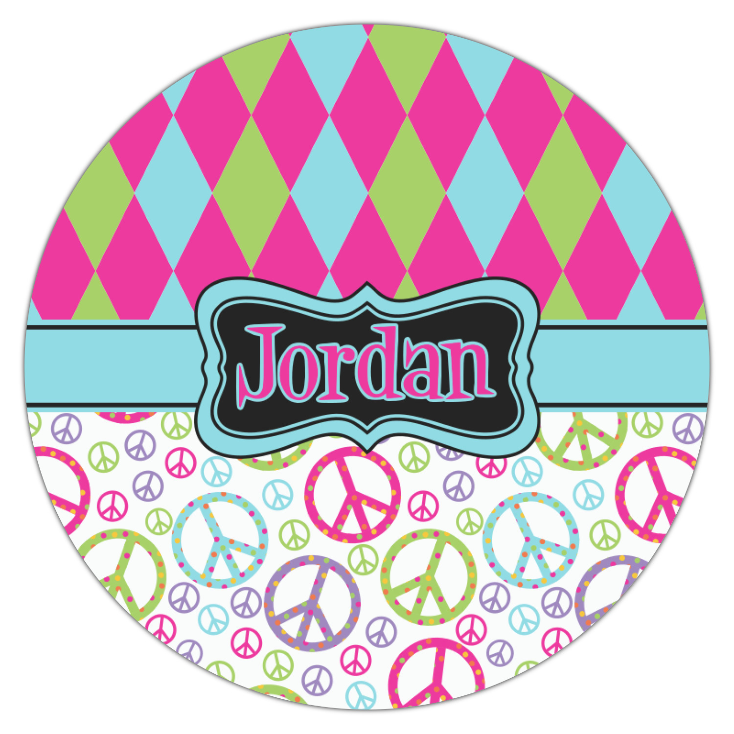 The Harlequin and Peace Signs Design is sure a nice throw back to the 70s. The retro design features harlequin print on the top half in hot pink, lime and light teal. The bottom half is colorful peace signs in the same color scheme on a black background. The larger peace signs have fun polka dots and are surrounded by smaller solid colored peace signs.