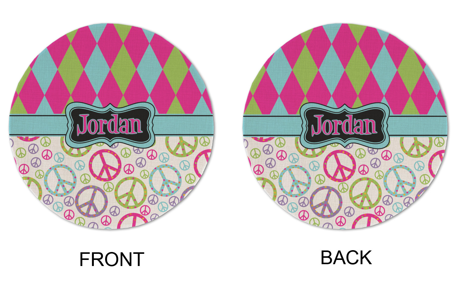 The Harlequin and Peace Signs Design is sure a nice throw back to the 70s. The retro design features harlequin print on the top half in hot pink, lime and light teal. The bottom half is colorful peace signs in the same color scheme on a black background. The larger peace signs have fun polka dots and are surrounded by smaller solid colored peace signs.
