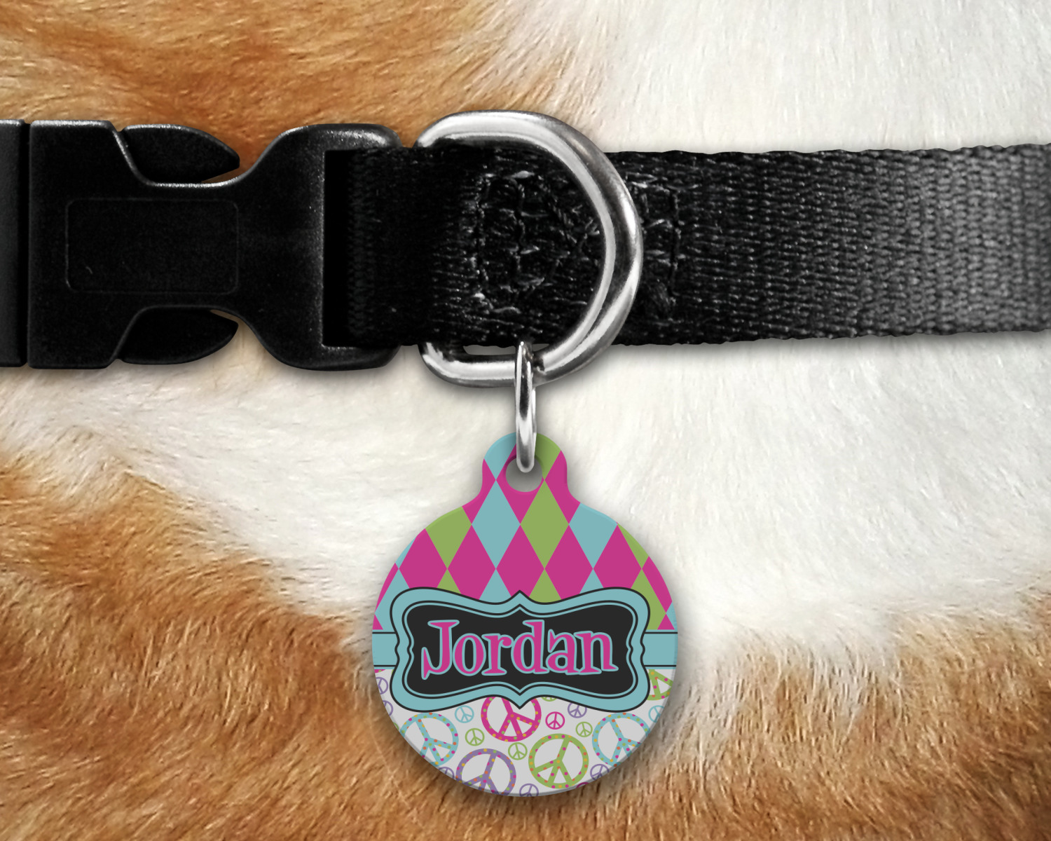 Go ahead; skip the monotony of plain pet ID tags with your very own, customized & personalized, round pet tag! This pet ID tag, fitting for both cats and dogs, will catch the eye of any onlooker (humans, canines, and felines, alike!) and accentuate your pet's individual personality.
