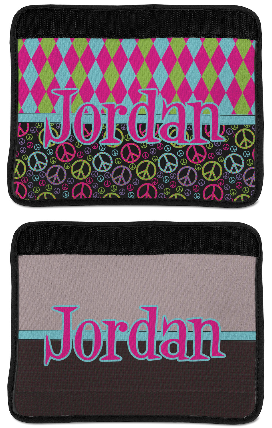 Made from neoprene, our seat belt strap covers wrap around the belt itself and have a Velcro tab for easy attachment and closure. The belt's edges are trimmed with a black polyester for a secure finish. Each cover is 9.5 by 7 inches when open and 9.5 by 2.5 inches when closed. We print your personalized design on the face of the seat belt pad.
