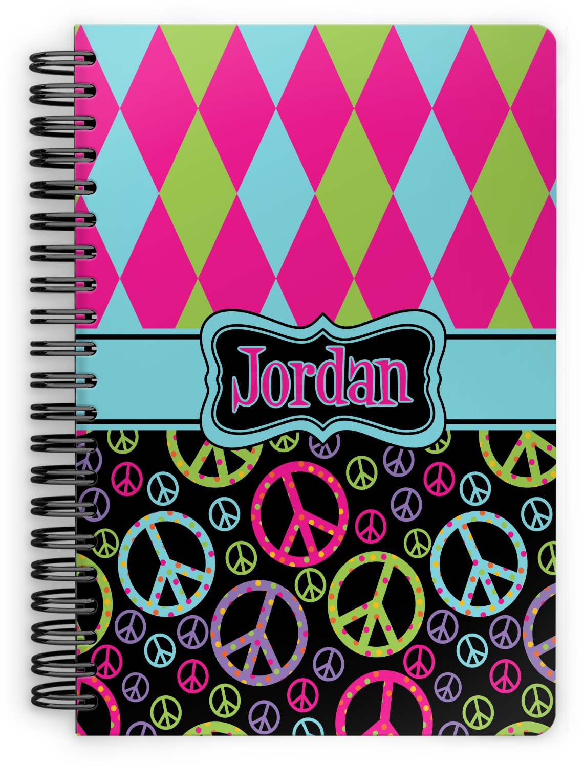 This spiral notebook includes 75 sheets of thick, ruled paper. The front and back of this custom notebook is made of a robust, laminate, plastic covering. We print your personalization on these two panels, underneath a glossy finish, which emphasizes the colors of your design. The two panels and the sheets of paper are held together by a sturdy, black coil. The paper within your bound notebook is perforated for easy, clean tearing.