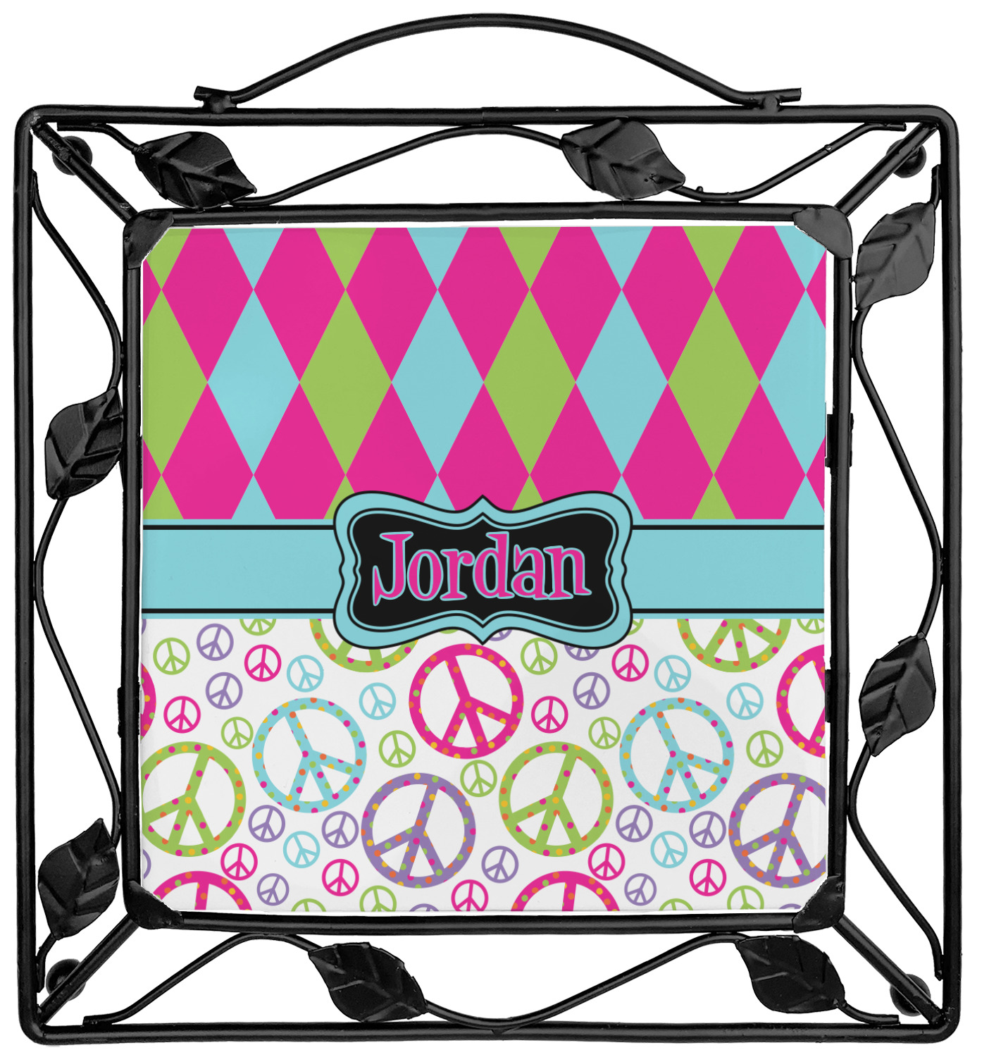 Our square trivets are made from a durable, wrought iron. This model features 4 small half circles, one on each corner, and a larger ring of iron that circles the central, customized tile. Each of the 4 corners has a round foot on its bottom for stability. This trivet is 8.75 by 8.75 inches, but the central tile measures at 6 inches on both sides.