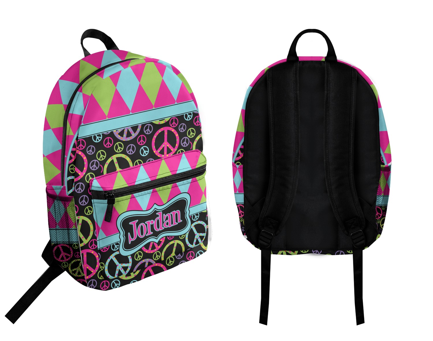 The Harlequin and Peace Signs Design is sure a nice throw back to the 70s. The retro design features harlequin print on the top half in hot pink, lime and light teal. The bottom half is colorful peace signs in the same color scheme on a black background. The larger peace signs have fun polka dots and are surrounded by smaller solid colored peace signs.