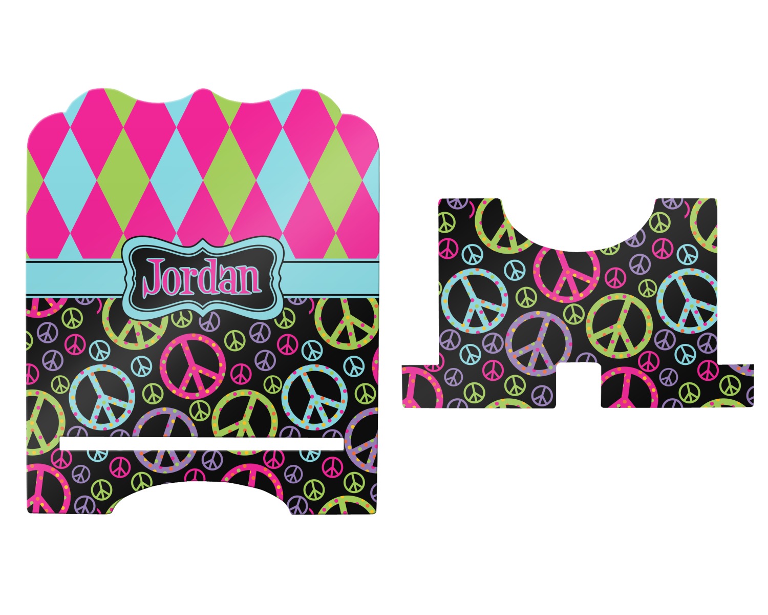The Harlequin and Peace Signs Design is sure a nice throw back to the 70s. The retro design features harlequin print on the top half in hot pink, lime and light teal. The bottom half is colorful peace signs in the same color scheme on a black background. The larger peace signs have fun polka dots and are surrounded by smaller solid colored peace signs.
