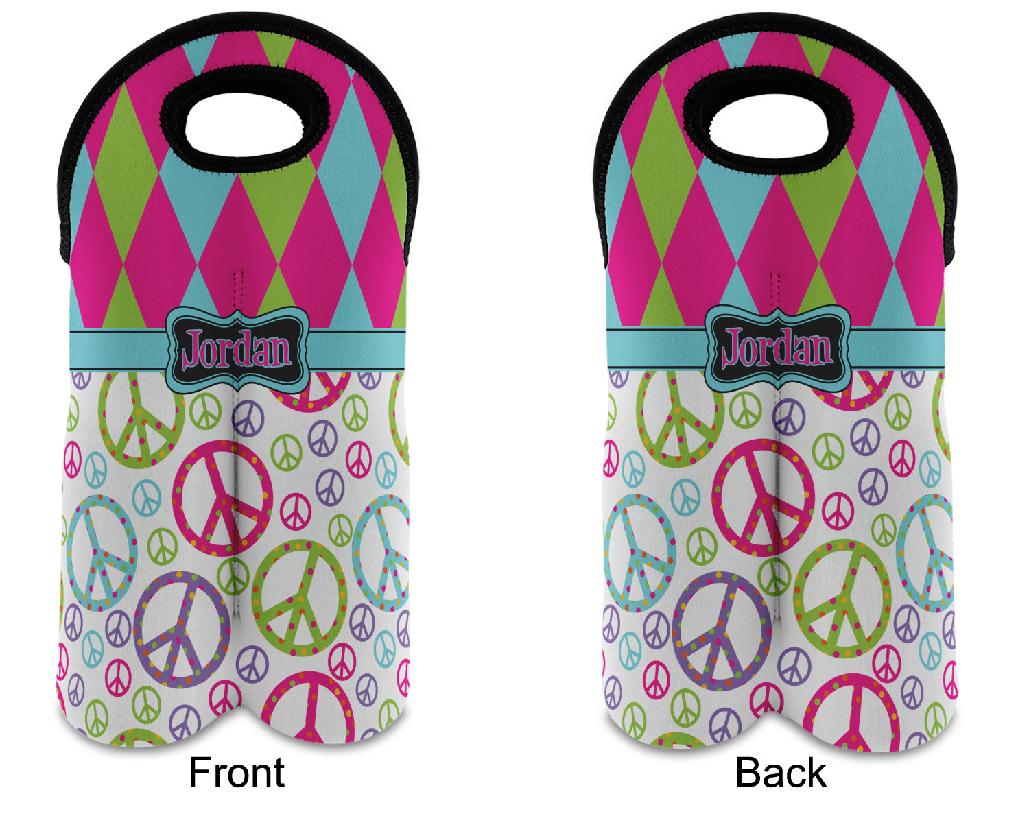 These tote bags are insulated to keep the bottles cold and have a stitched separation down the middle and double handles to keep the two bottles safe and secure during travels.