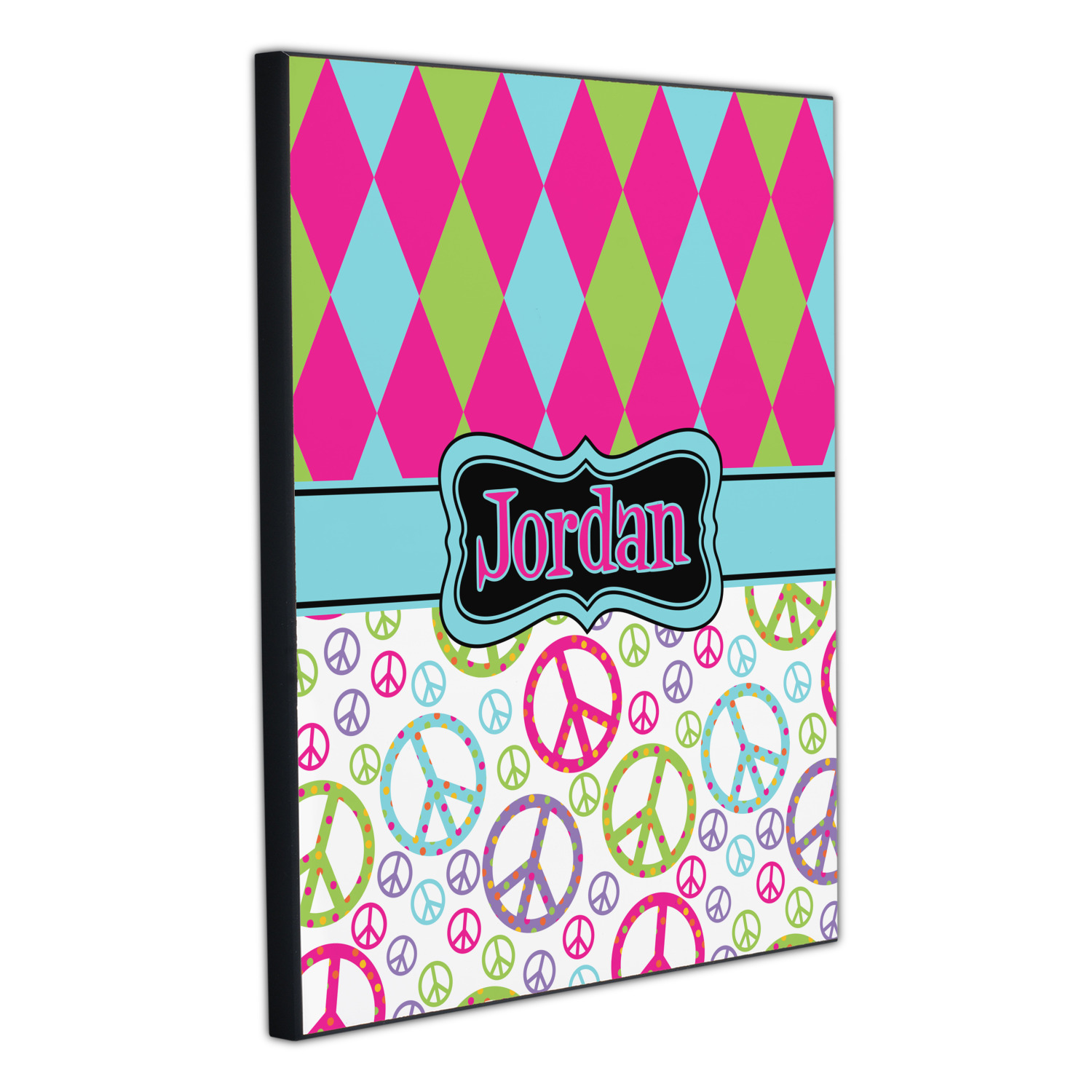 The Harlequin and Peace Signs Design is sure a nice throw back to the 70s. The retro design features harlequin print on the top half in hot pink, lime and light teal. The bottom half is colorful peace signs in the same color scheme on a black background. The larger peace signs have fun polka dots and are surrounded by smaller solid colored peace signs.