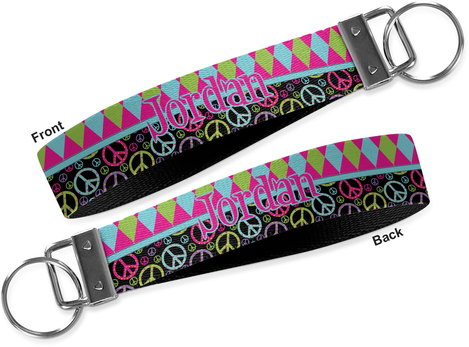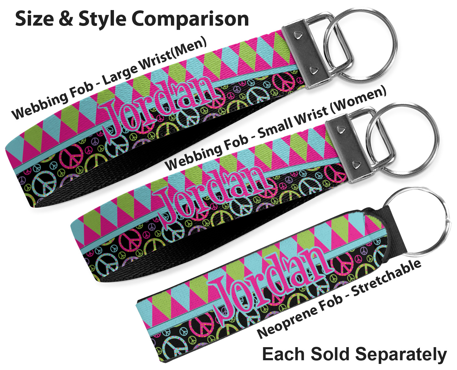These key fob keychains are made from a polyester weave, right here in the USA. They feature a silver, metal clasp, attached to a round keyring. The piece gives the personalized wristlet a beautiful, finished look. Your customized design is printed on the outside of the keychain strap. We carry these wristlets in two sizes: small, which is 5 inches in width, and large, which is 5.5 inches in width.
