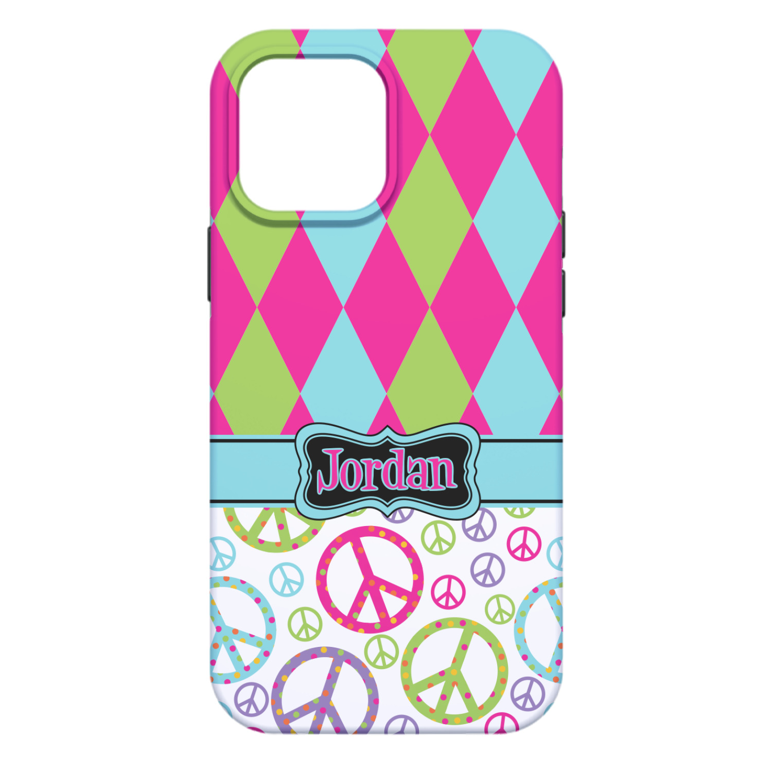 The Harlequin and Peace Signs Design is sure a nice throw back to the 70s. The retro design features harlequin print on the top half in hot pink, lime and light teal. The bottom half is colorful peace signs in the same color scheme on a black background. The larger peace signs have fun polka dots and are surrounded by smaller solid colored peace signs.