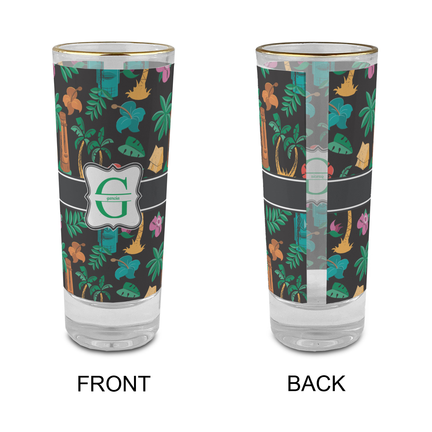 These glass shooter glasses are printed in full color with the design of your choice. These are a tall shooter 2 oz size and stand 4" tall. The print is a full wrap design to boldly display your personalization.
