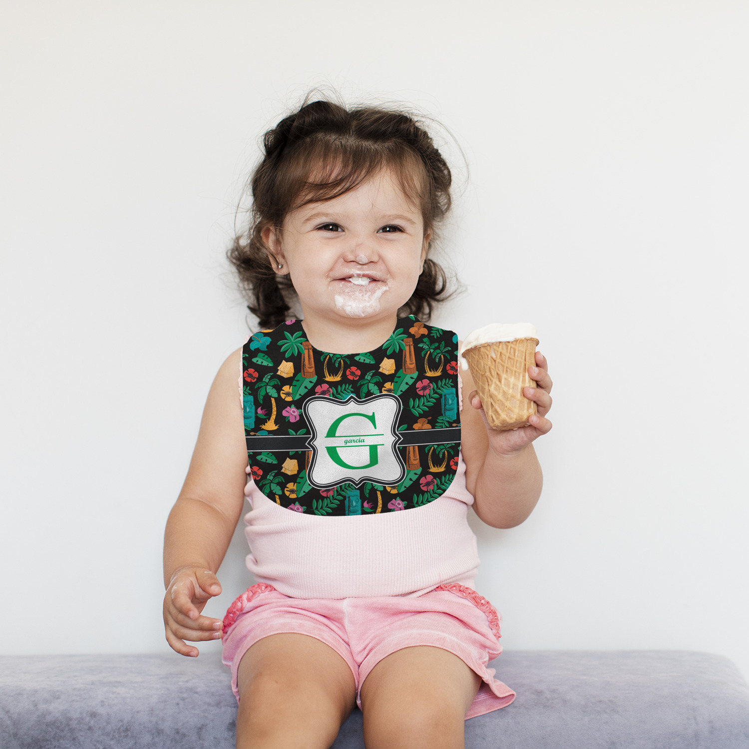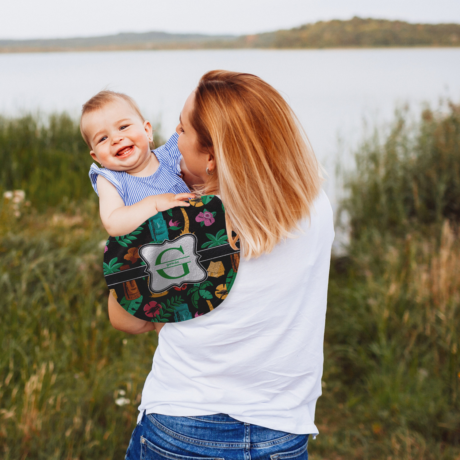Both our baby bib and burp pad are made up of soft, microfiber velour with a cotton backing. The comfortable and plush material of our bib and burp set is perfect for both baby and parent. We print your design on the microfiber velour face fabric with baby safe ink on your customizable bib and burp cloth to ensure safety for the little one! Our drool bib also comes with a Velcro clasp for safe and easy wear while the burp cloth is a unique peanut shape that perfectly hugs over the shoulder.