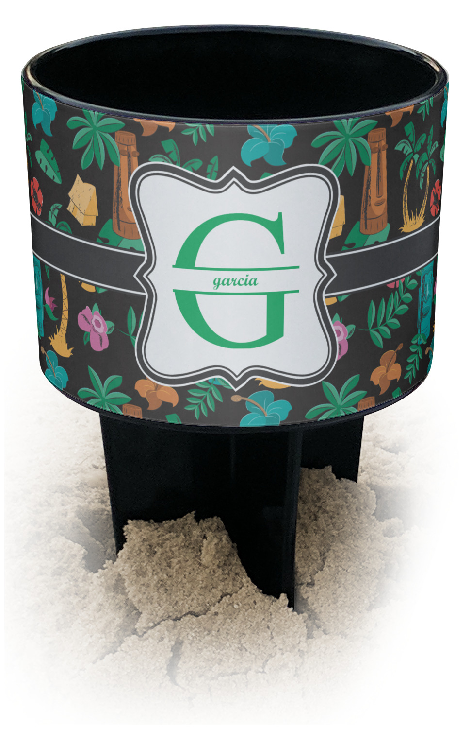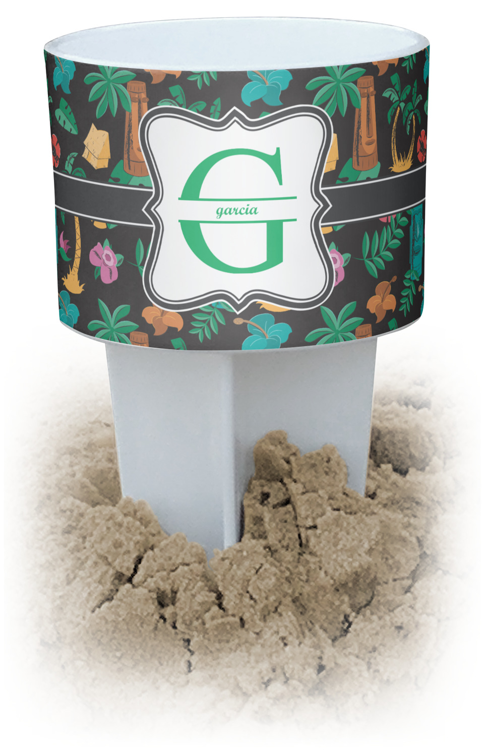 This cup holder has a large stake at its bottom that anchors it to the sand or ground below, while the cup holder rests above the stake. The entire drink holder is made of durable plastic and displays your customization around the cup holder portion. We sell these personalized beach spikers in two different colors: black and white.