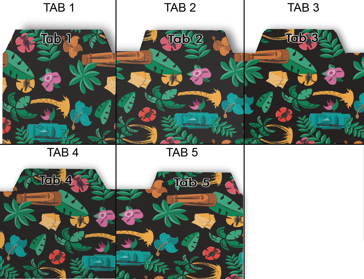 Whether you use binders at school or at work, we have designs to suit all of them. Available in 5 or 6 tab sets, you are sure to find a set to suit your needs. The back of each one is white and can be used to take notes, write vital information on, etc.