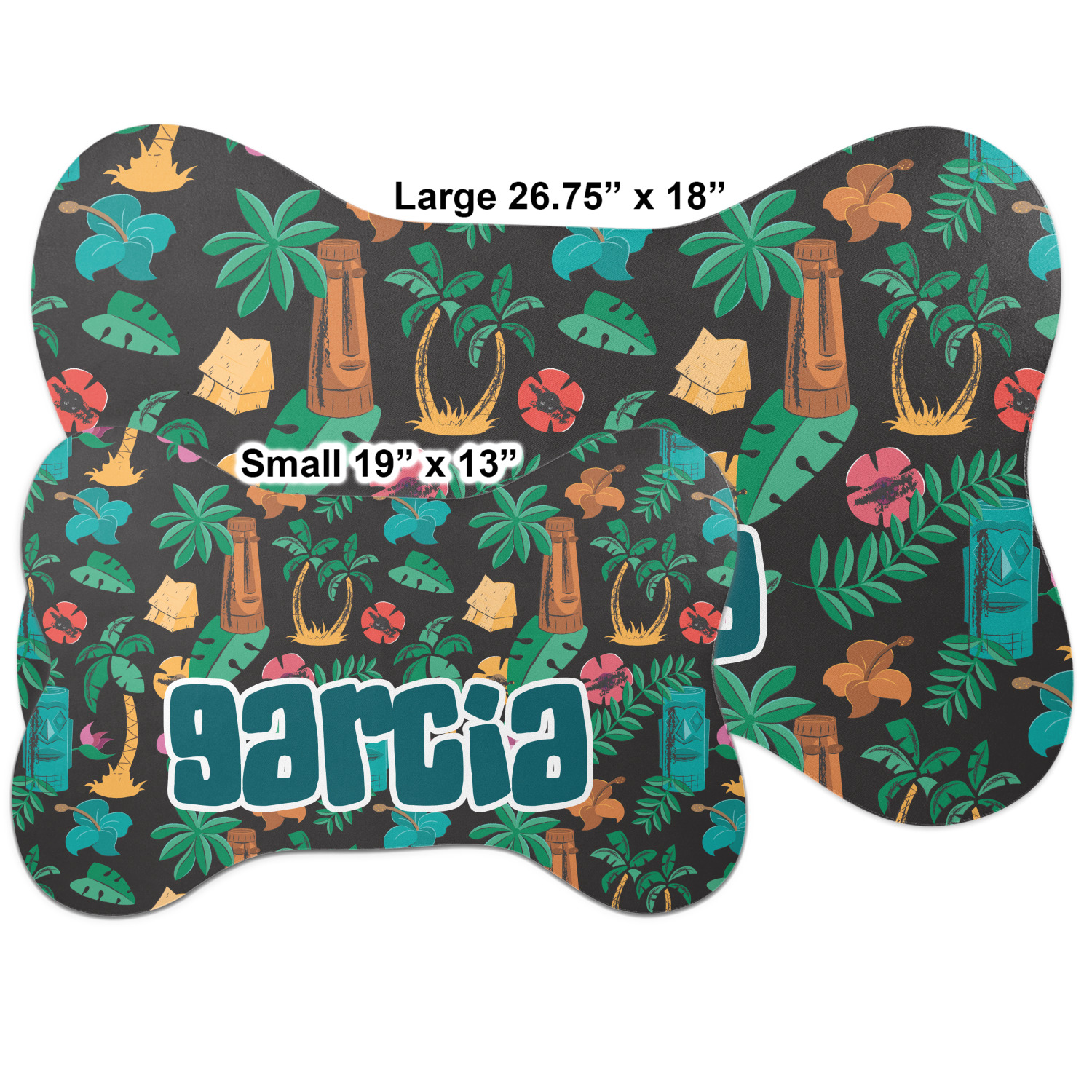 The top of this mat displays your custom design, as it is printed on polyester. To prevent slippage, the underside of the mat is made of rubber. We offer a small dog food mat, suitable for smaller dogs and a large dog food mat for bigger breeds. The small dog food mat is approximately 19 by 13 inches, while the large dog feeding mat measures at approximately 26.75 by 18 inches. Both personalized mats are ideally sized to fit two dog bowls.