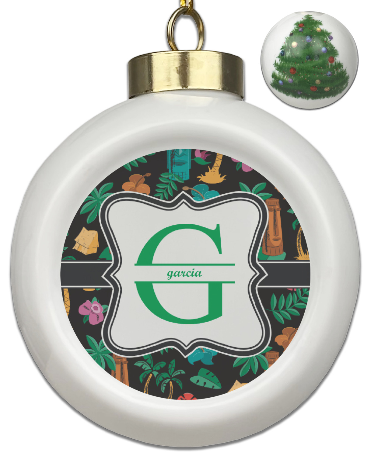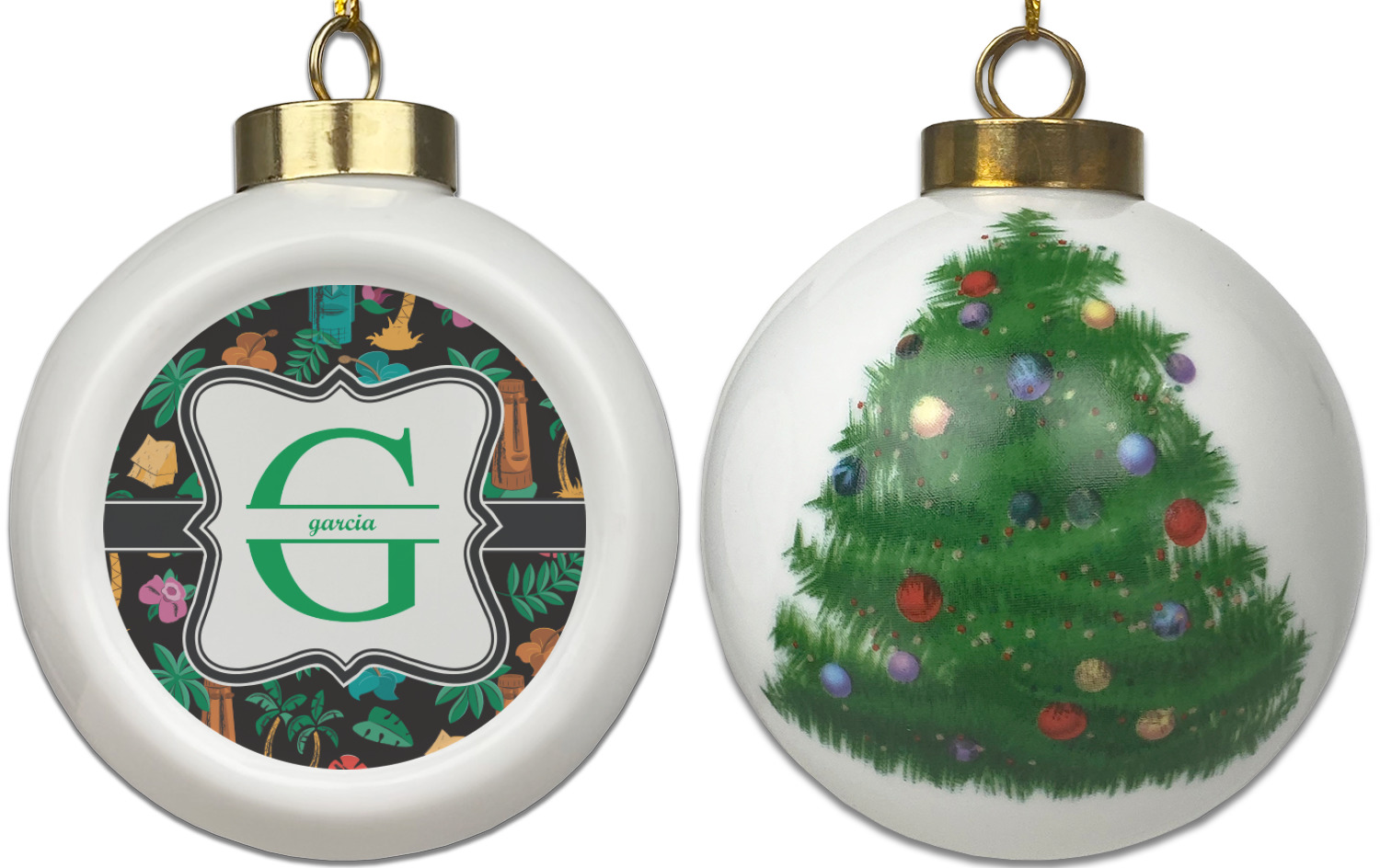 Our Christmas ornaments are a unique ceramic ball shape with a twist as it has a flat face to display your custom design! Select from one of our two design types - Christmas Tree or Poinsettia Garland - to adorn the curved back of your personal design. Each ornament measures 3H x 2.5W x 2D accompanied with a gold string accent for finishing touches to hang on your beautiful Christmas tree!