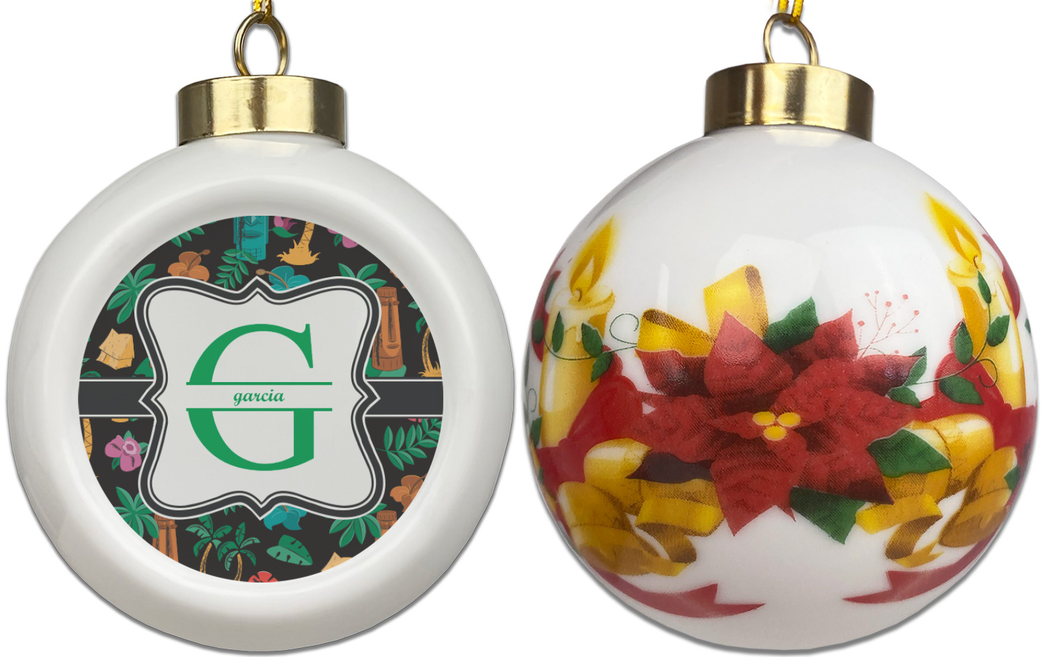 Our Christmas ornaments are a unique ceramic ball shape with a twist as it has a flat face to display your custom design! Select from one of our two design types - Christmas Tree or Poinsettia Garland - to adorn the curved back of your personal design. Each ornament measures 3H x 2.5W x 2D accompanied with a gold string accent for finishing touches to hang on your beautiful Christmas tree!