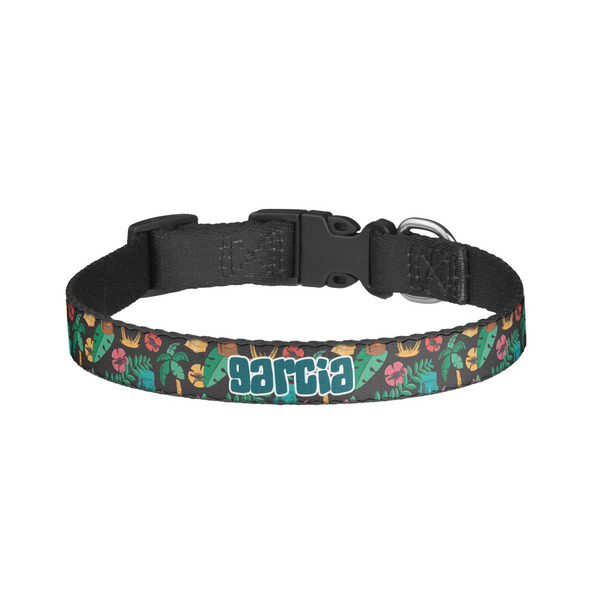 This sturdy collar, made from a durable nylon weave, will outlive your dog's episodes of excited tugging and pulling. Courtesy of its thick plastic buckle and adjuster, this collar is adjustable and accommodating of any dog. Structurally, the collar is a single piece of nylon weave that is sewn together, and features a solid metal loop where you can attach a leash or dog tag. We print and display your dog's name and pattern across the middle of the personalized dog collar.
