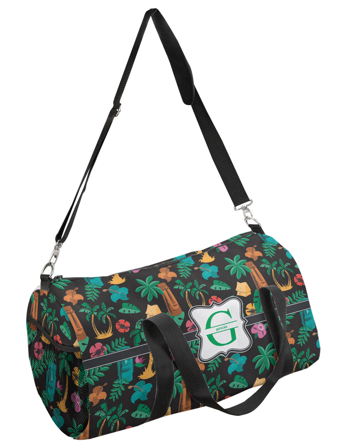 This duffle is a sturdy bag made of a canvas material. It comes in two sizes: Small (19"W x 9.5"H x 9.5"D) and Large (23"W x 12"H x 12"D). The bag is a cylindrical shape with a black adjustable strap and two handles. On one side is an elastic pouch to put a waterbottle or other small item. Your product will be sublimated with your design and is able to be designed on the front, back, and sides. Be sure to remember that the straps may cut into parts of your design if you upload your own artwork.