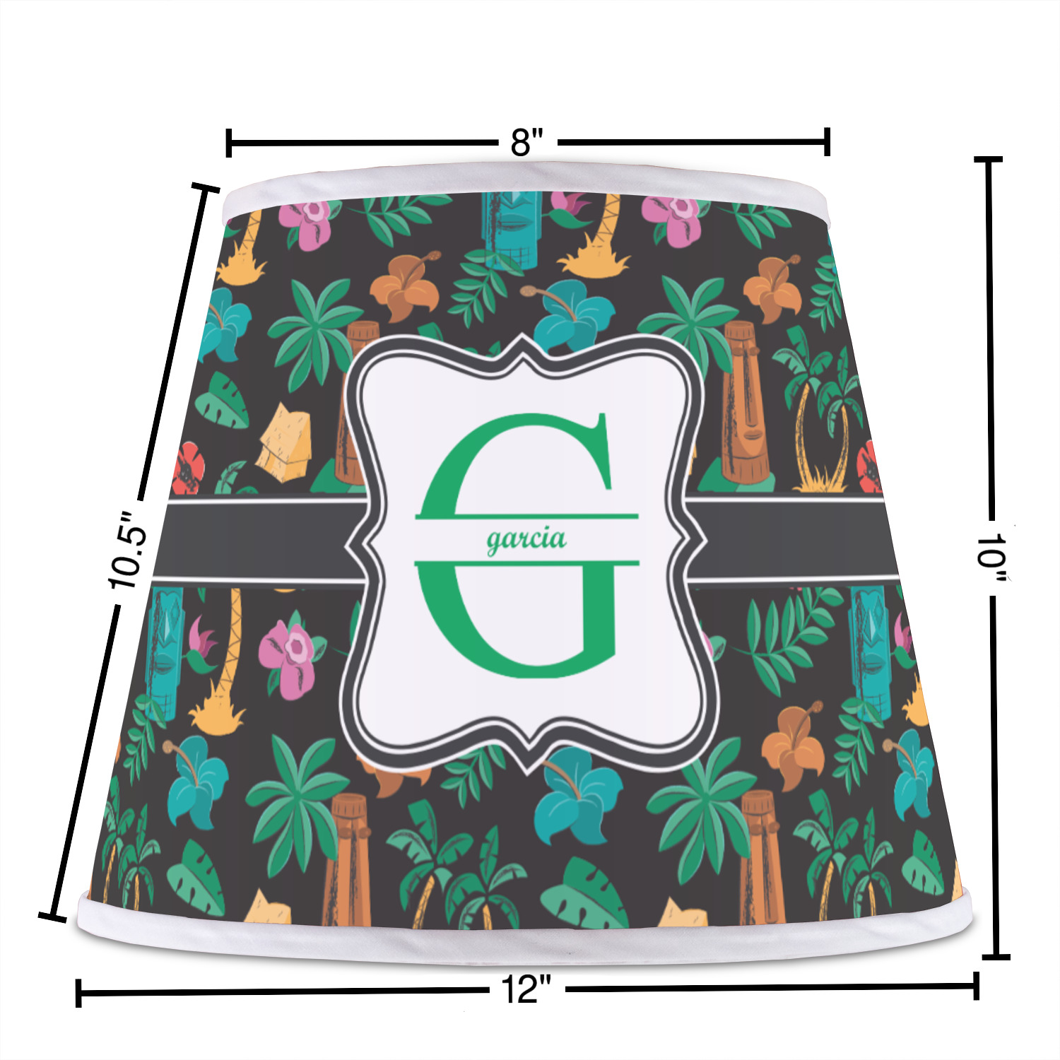 The base of this lampshade is 12 inches in diameter, and the top spans 8 inches in diameter. The total height of the lampshade is 10 inches. The angled nature of this custom lampshade concentrates the light, making it ideal for smaller spaces. This lampshade is made of matte, polyfilm, and displays your customization in its middle. The top and bottom of this colorful lamp shade are lined with a white fabric ribbon (which can be replaced with black inside the design studio) which frames your design and creates a sophisticated finish. As an UNO fitter lampshade, this unique lamp shade will fit a variety of bases.