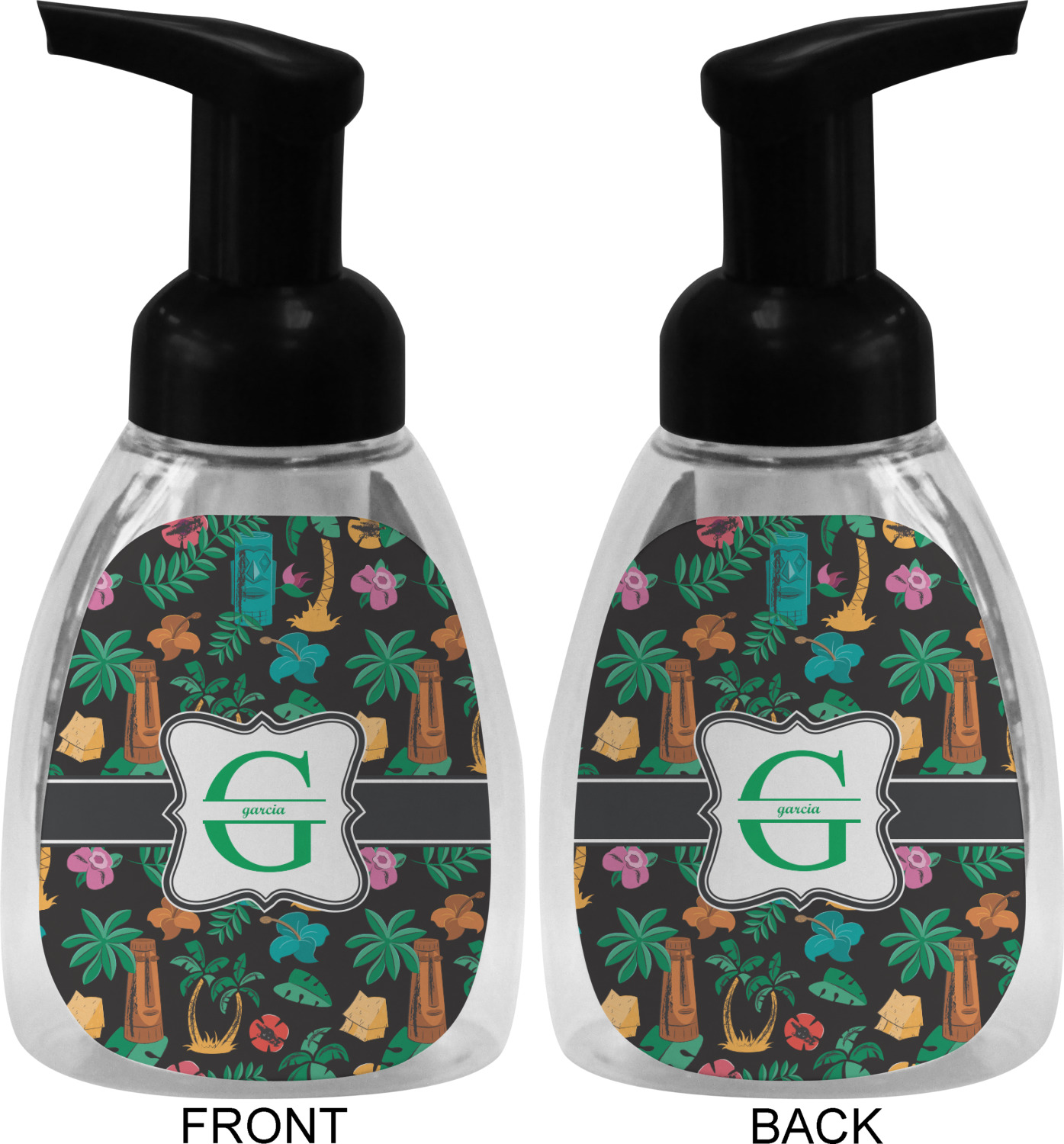 This soap dispenser is made of a robust plastic and has a clear base. The included soap pump is available in black or white color. This dispenser is 6.5 inches tall, 3 inches wide, and 2 inches deep. We display your customized designs on the front and back sides of these foaming hand soap dispensers.