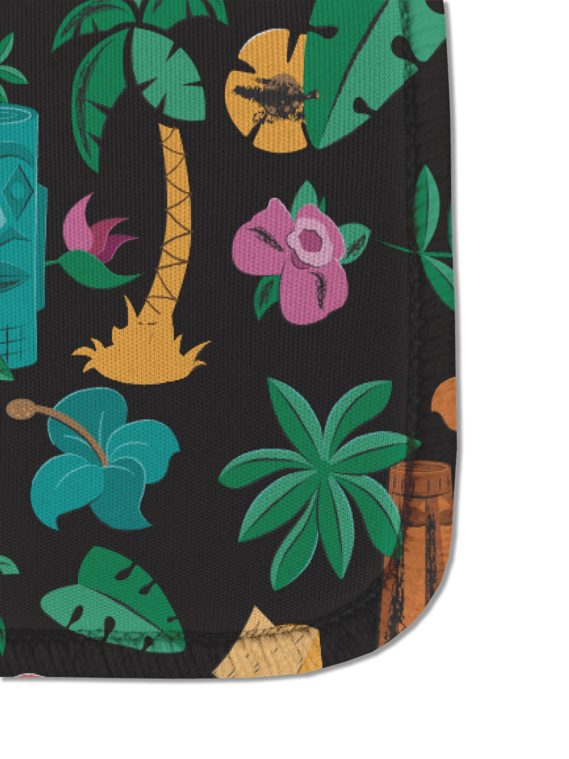 What's more classic Hawaiian than palm trees, tiki heads, and flirty flowers? This bright design will send you straight back to better days, spent lounging on a beach in some tropical paradise.
