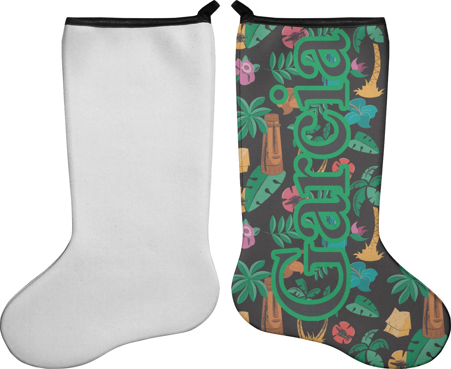 These 17" x 11" stockings are made of neoprene and have a black trim to give them a fantastic finished look. Your very own design is printed right onto the stocking, either single sided with white on the back or double sided where can use the same or different designs / patterns on the front and the back - the choice is yours. At the top of the stocking is a 2" loop for hanging.