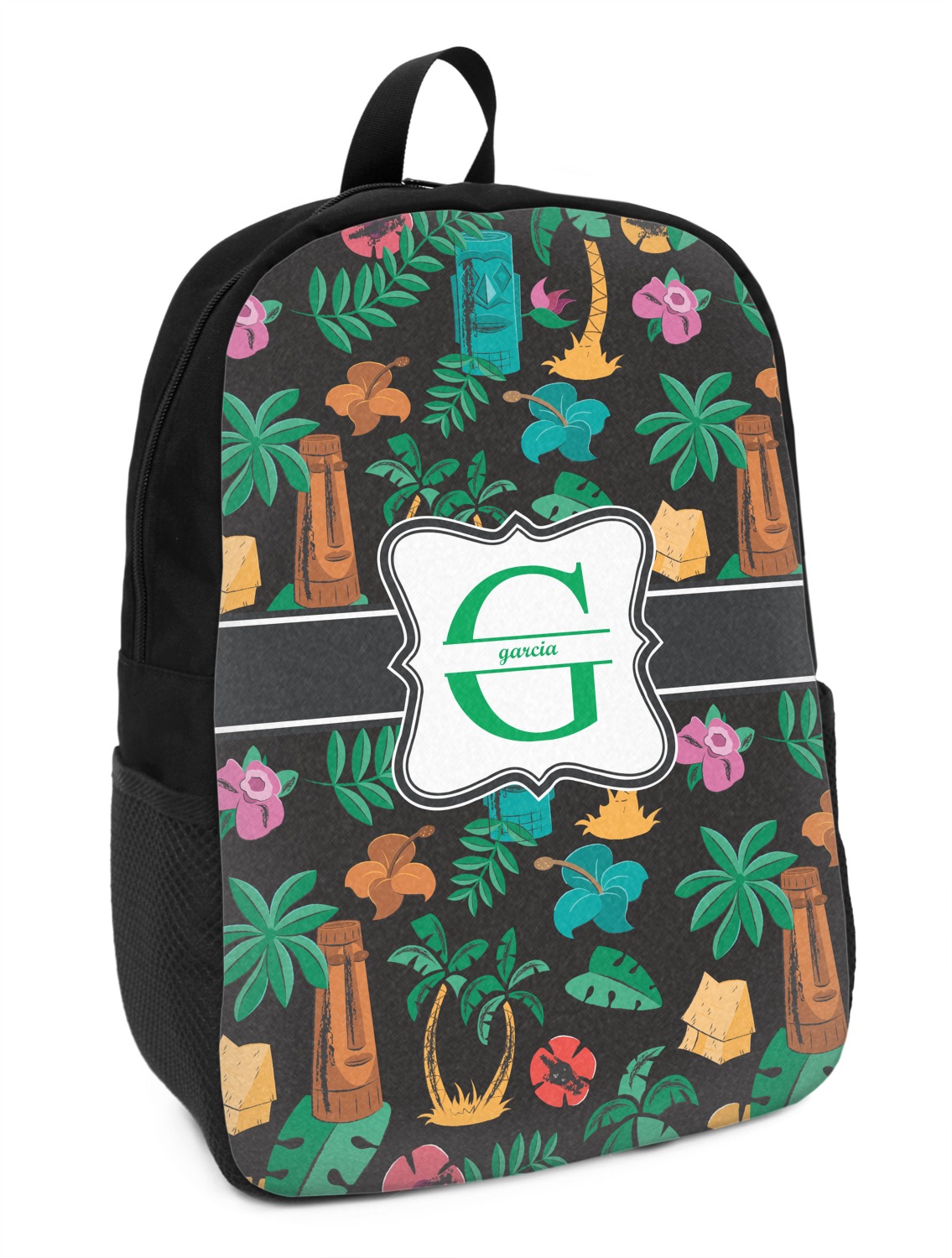 These small backpacks are made of a durable black canvas material with your personalization right on the front. The two shoulder straps are padded and easily adjustable. The bag itself measures at about 11" W x 15" H x 5" D. It's the perfect size for elementary aged kids or adults who want a smaller backpack. On the top of the bag you will find a handle to hang or carry your backpack by as well as a large zipper closure to keep all of your belongings safe inside. On each side of your backpack is a mesh pocket for a small item or water bottle. Inside your backpack you will find a spacious area with a small zipper pocket and a padded laptop slot that will fit up to a 13" laptop (13" being very snug). This is the perfect bag for any student that needs a couple books and their laptop with them at all times. It also works great as a carry on for traveling!
