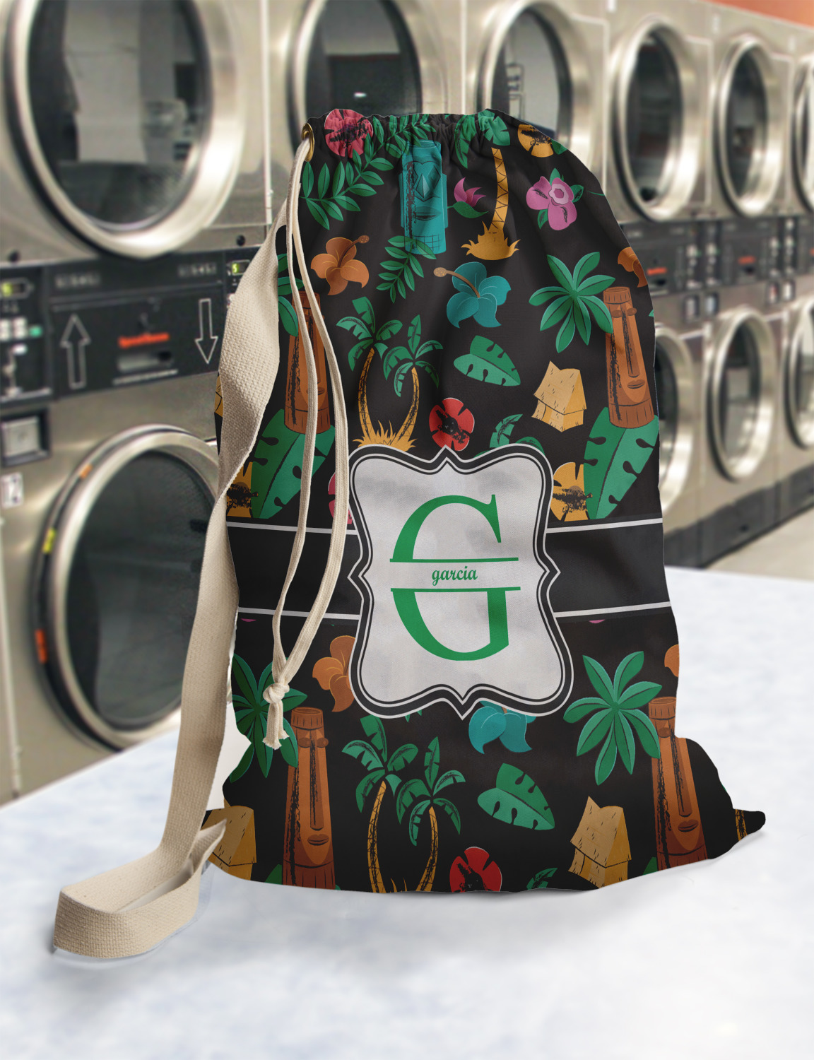 Carry your laundry in style with these customized laundry bags. Available in two sizes, featuring a natural colored woven strap and a cinch cord, these bags hold a lot of clothes or anything else you want to fit in them.