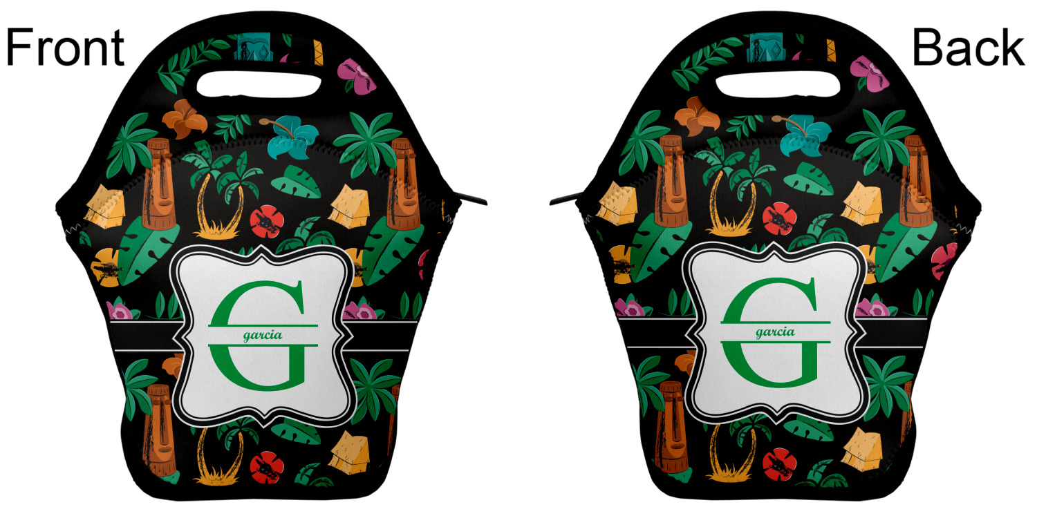 Our personalized lunch bags are made from a strong neoprene, and secure with a zipper closure that lines the top of the bag.The edges of the neoprene are sewn together with a heavy duty stitch, adding to the durability of the bag. The is accompanied by a reinforced handle at its top, for the easy transport of your lunch. We display your personalization across both the front and back of this neoprene lunch bag, while the remaining sides are a sleek black in color. Each bag measures at 13.5 inches tall, and 11.5 inches wide.