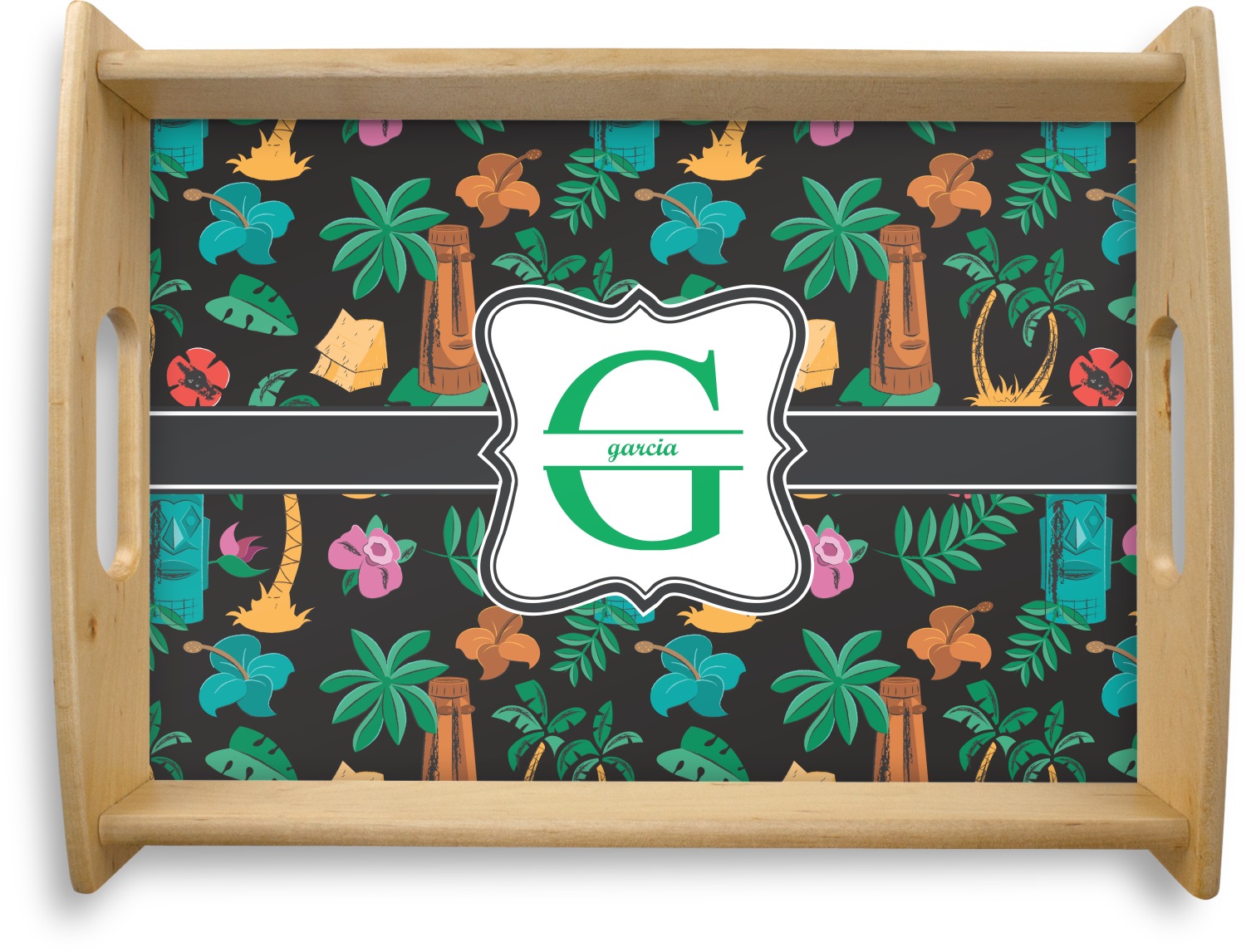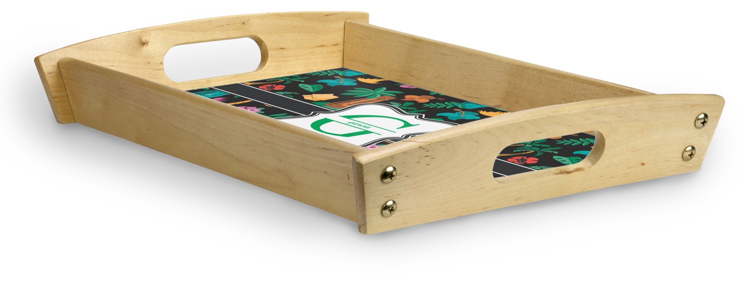 This serving tray with handles features square edges and two rounded sides, creating a very modern look. Each side is fabricated from a beautifully cut, natural wood. The bottom of the interior of the tray displays your customized design in bright, vibrant color. The tray is sold in both a black color and a natural wood look. Each variation of the wood serving tray has two sizes: Small, which is 14" x 10" x 2.25", and Large, which is 19.5" x 13.5" x 2.75".