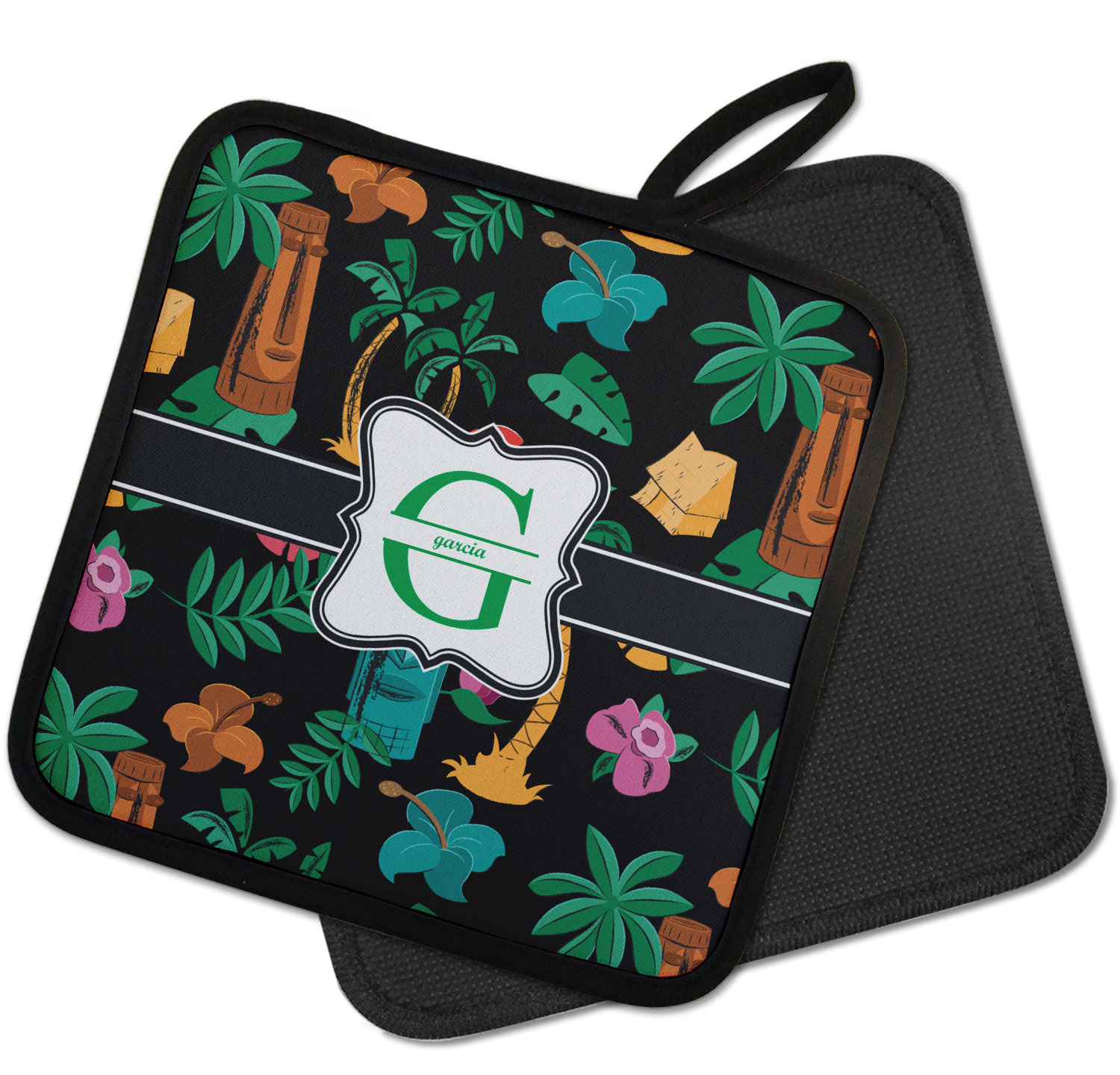 Our personalized pot holders feature a neoprene front that displays your personalization in vibrant colors. The backing of the hot pot holder is rubberized; the textured backing allows you to have a great grip when using this custom pot holder. The two materials are joined with a sleek, black trim, and the holder also includes an attached loop for hanging and storage. The pot holder is approximately 8.75 inches by 8.75 inches and 0.25 inches tall, while the fabric loop is 2.5 inches long. You can purchase a kitchen pot holder by itself or as a set of 2. We also offer a set including one pot holder and one oven mitt.