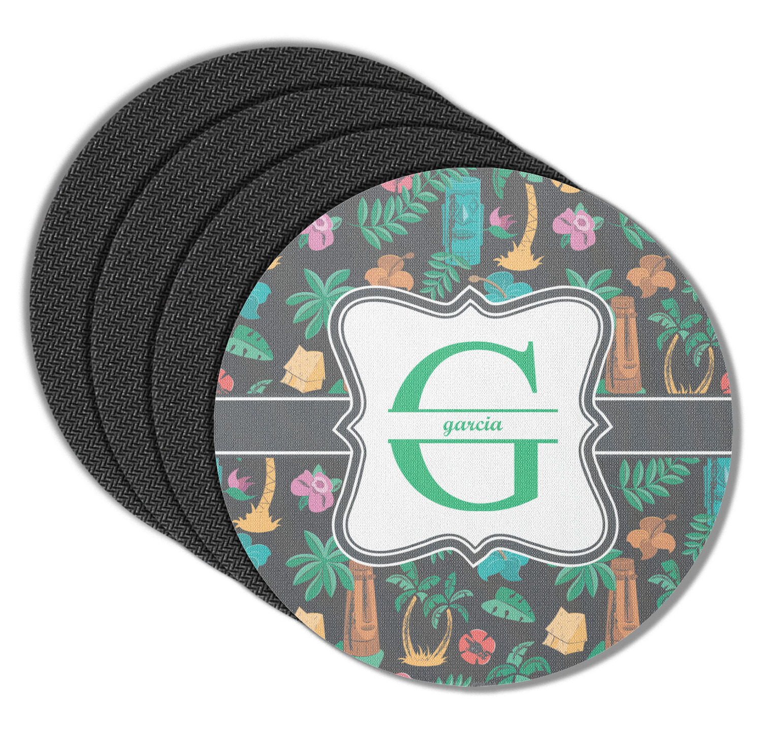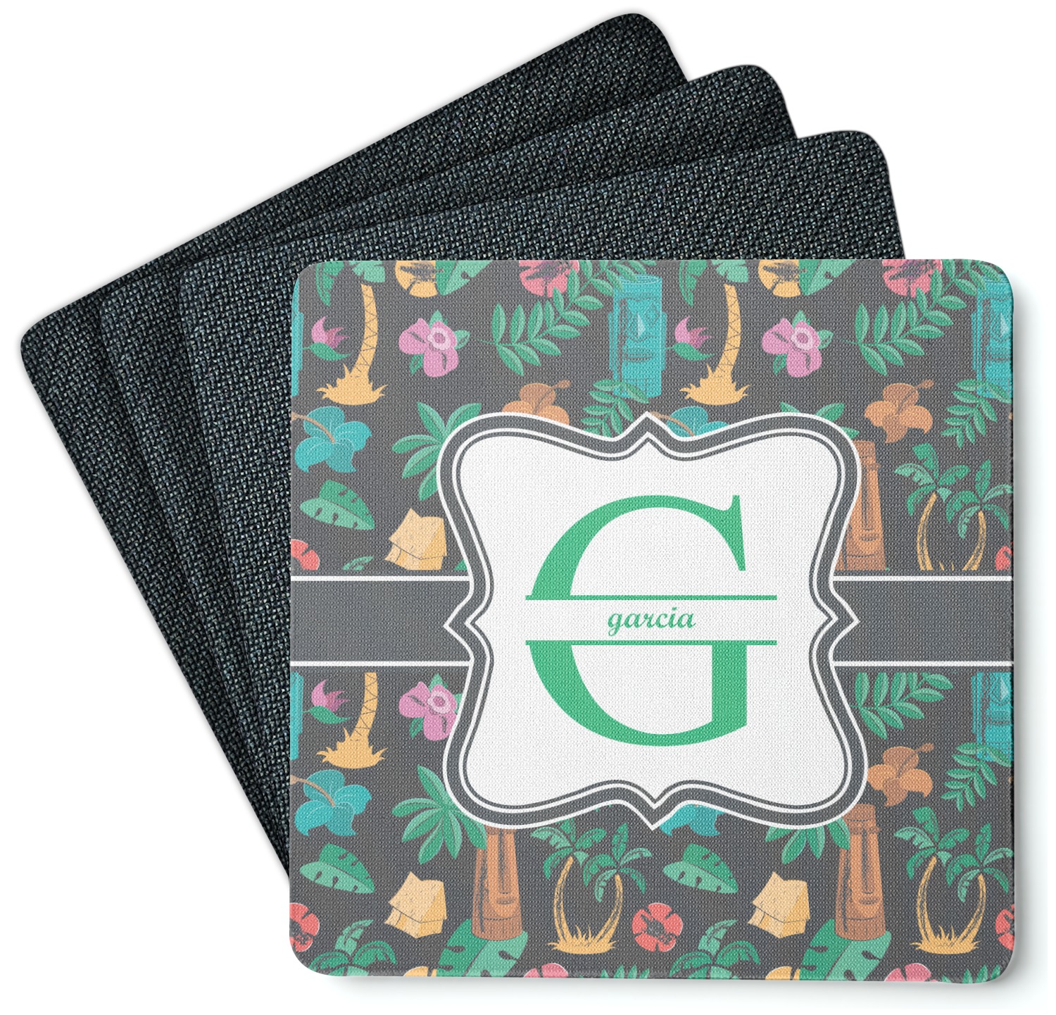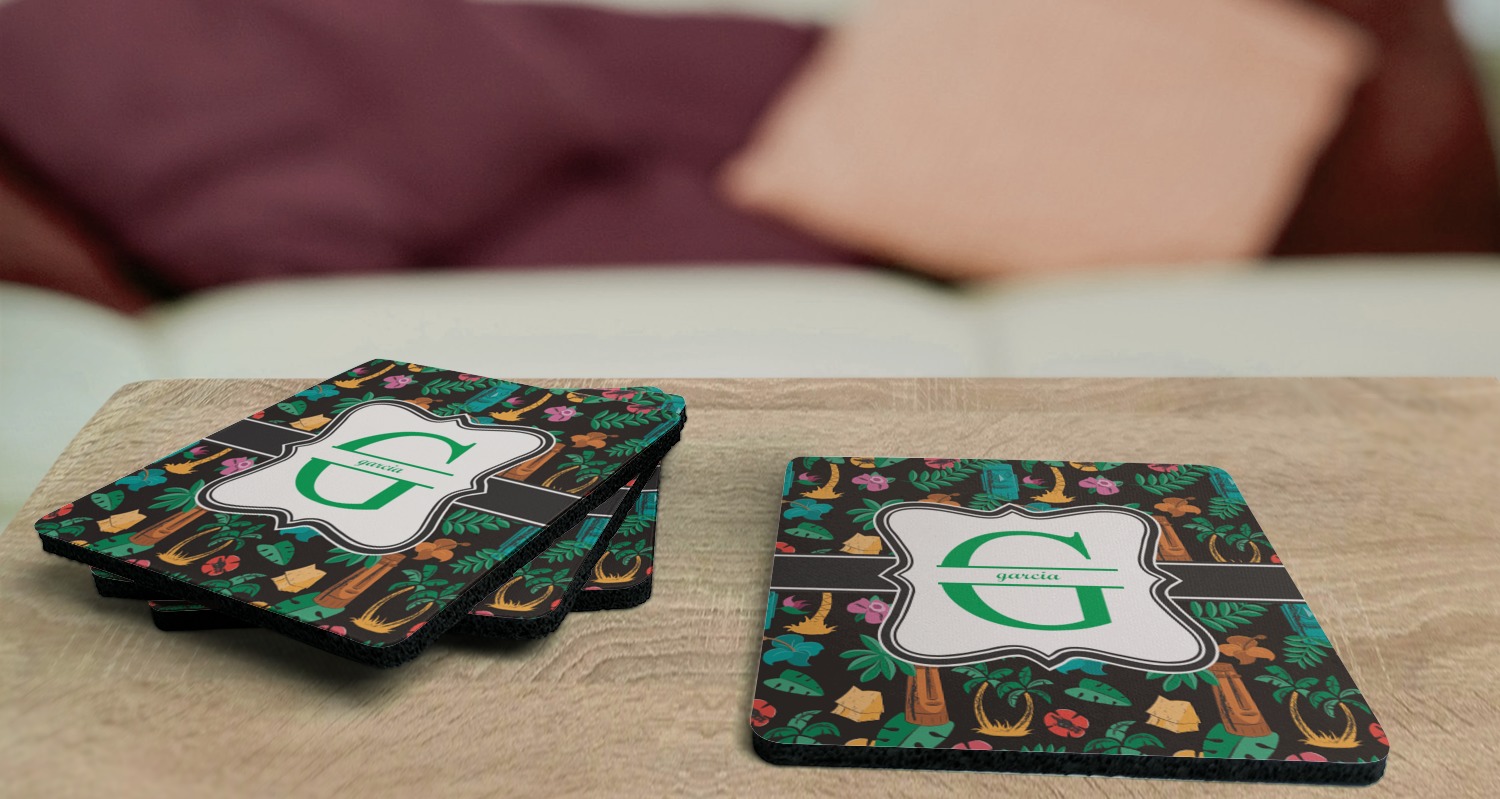 These drink coasters have a smooth, polyester top and a textured, rubber backing on its bottom. The non-slip rubber backing underneath works to keep any spills at bay. At 4 by 4 by 0.25 inches thick, these custom coasters are a suitable size for most drinkware. Your personalization is displayed atop the face of the cup coaster. We sell these rubber coasters in two different shapes: square and round. You can buy each shape as singulars or as a set of 4.